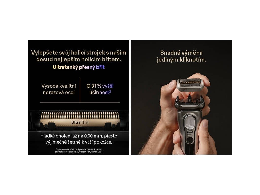 S mimořádně tenkými přesnými břity holí efektivněji než jakýkoli předchozí elektrický holicí strojek Series 9 a přináší neuvěřitelně šetrné oholení