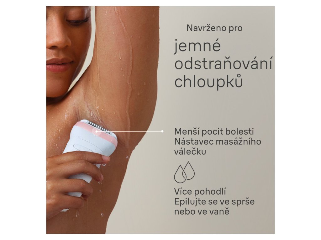 Jemné odstranění chloupků: Použití na sucho i na mokro. Pro omezení pocitu bolesti provádějte epilaci jemně, ve sprše nebo ve vaně.
