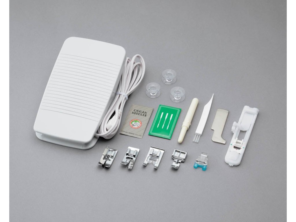 U stroje najdete bohaté příslušenství – 7 patek, se kterými ušijete téměř všechno, náhradní jehly, šroubovák, štěteček, páráček. Navíc dostanete ke stroji měkký kryt proti prachu, samozřejmostí je český návod, pedál a kabel.