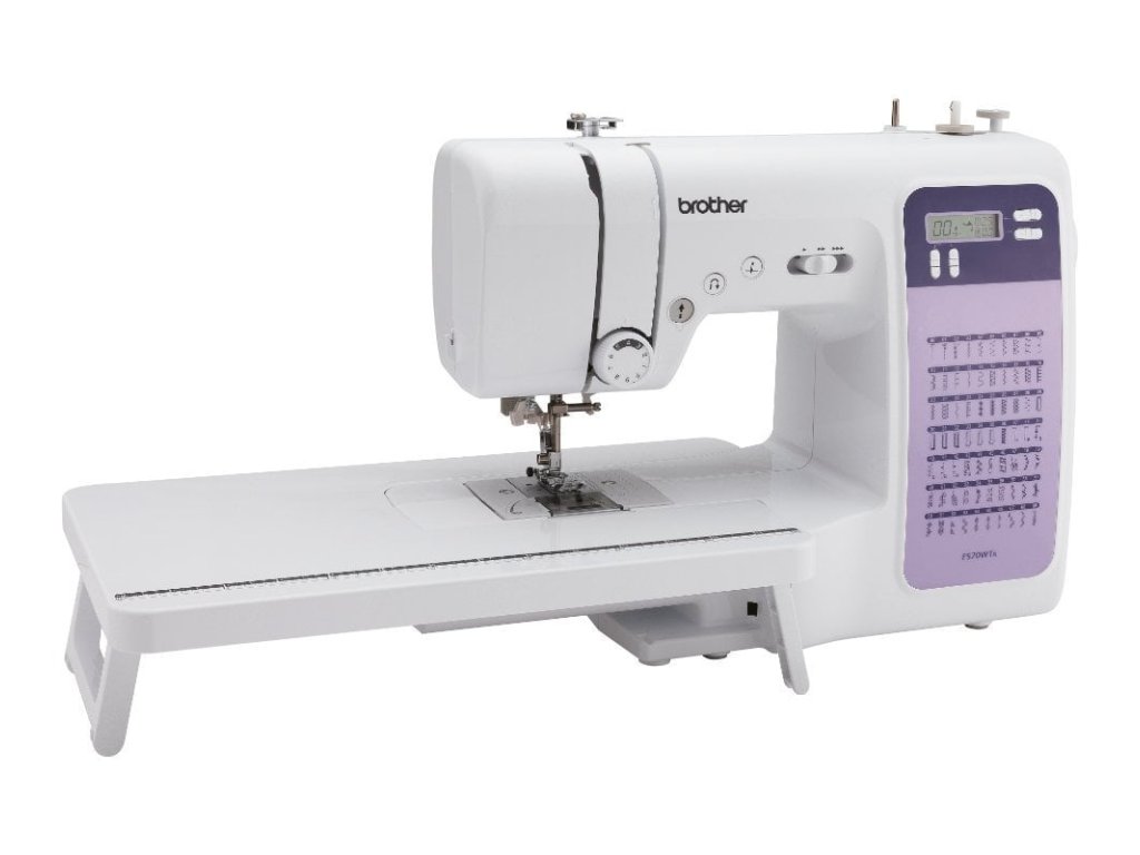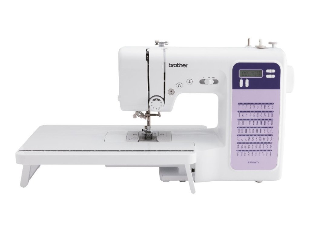 Elektronický šicí stroj Brother FS70WTx, 70 programů, 7 druhů automatických knoflíkových dírek, zapošívání, plynulé nastavení délky a šířky stehů, volné rameno, navlékač nitě do jehly, nastavitelná volba polohy jehly nahoře/dole