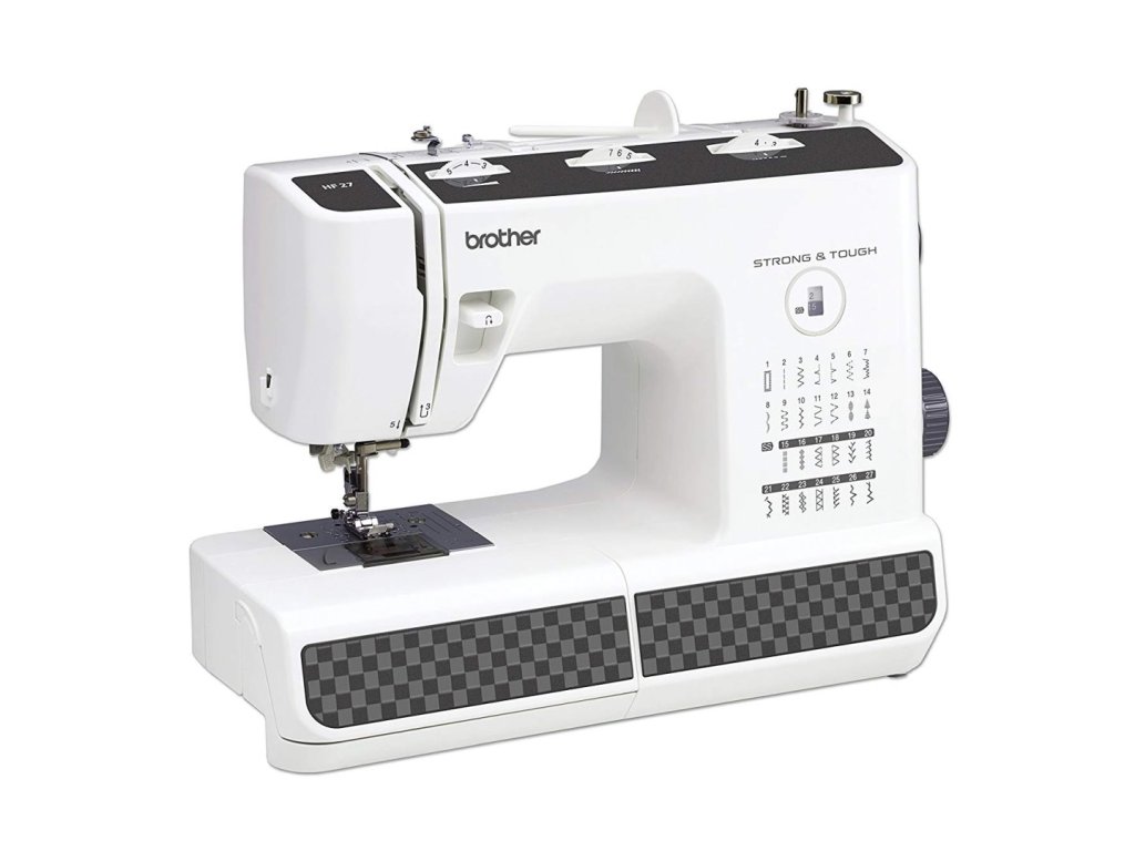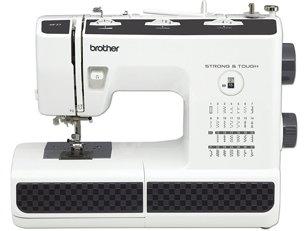 Šicí stroj Brother HF27, 27 programů včetně šití knoflíkových dírek na jeden krok, praktické volné rameno, vyrovnávací tlačítko na šití silnějších materiálů, nastavitelná délka stehu do 4 mm a šířka stehu do 7 mm, automatický navlékač nitě do jehly