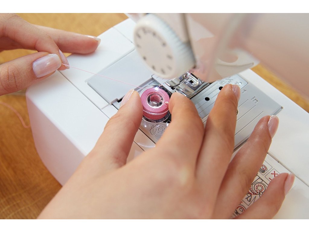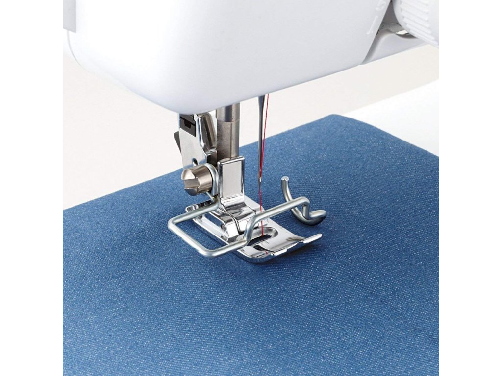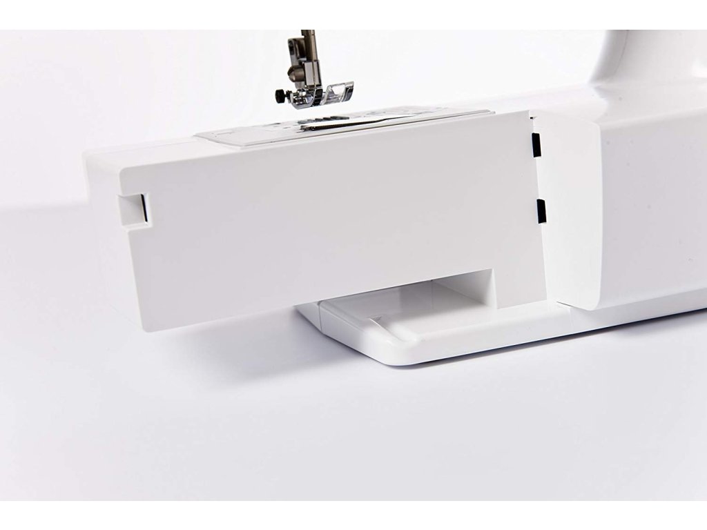 Šicí stroj určený pro děti +14 i pro dospělé, mechanický chránič prstů, 14 pevně daných programů včetně knoflíkové dírky šité na 4 kroky, zpátkování pomocí páčky, volné rameno, LED osvětlení