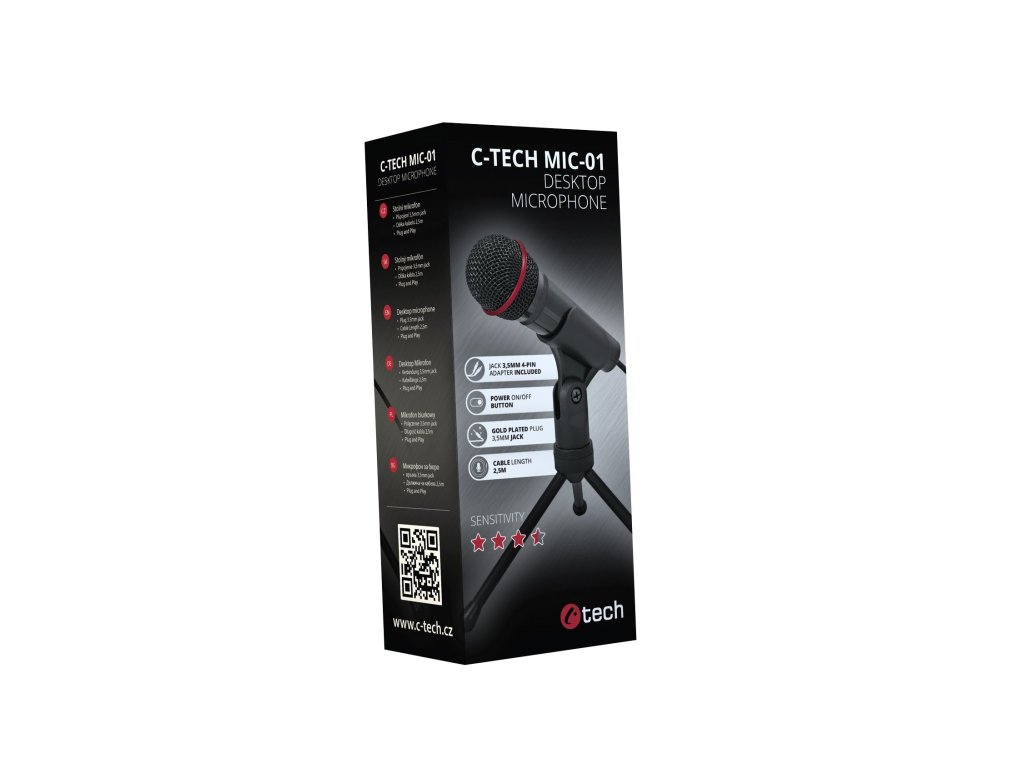 C-TECH MIC-01 je kvalitní mikrofon s přirozenou kvalitou reprodukce hlasu pro každodenní použití. Své uplatnění najde jak při použití s komunikačními programy, tak i při vytváření youtube videí nebo live přenosů. Mikrofon se připojuje pomocí 2,5m kabelu s pozlaceným stereo konektorem jack 3,5mm, v balení však naleznete i redukci jack stereo 3-pin/4-pin pro připojení mikrofonu k zařízení, které je vybaveno sloučeným audio konektorem pro mikrofon a sluchátka. Mikrofon je vybaven zapínacím tlačítkem ON/OFF. V balení naleznete praktický podstavec (tripod), díky kterému lze umístit mikrofon do různých poloh.