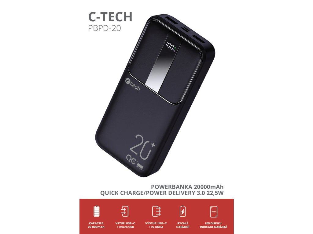 Představujeme vám novou powerbanku C-tech PBPD-20 s kapacitou 20000mAh, která v sobě spojuje výkon, rychlost a elegantní design. Tato powerbanka využívá pokročilé Li-pol články, což zajišťuje spolehlivý a dlouhotrvající zdroj energie pro vaše mobilní zařízení.