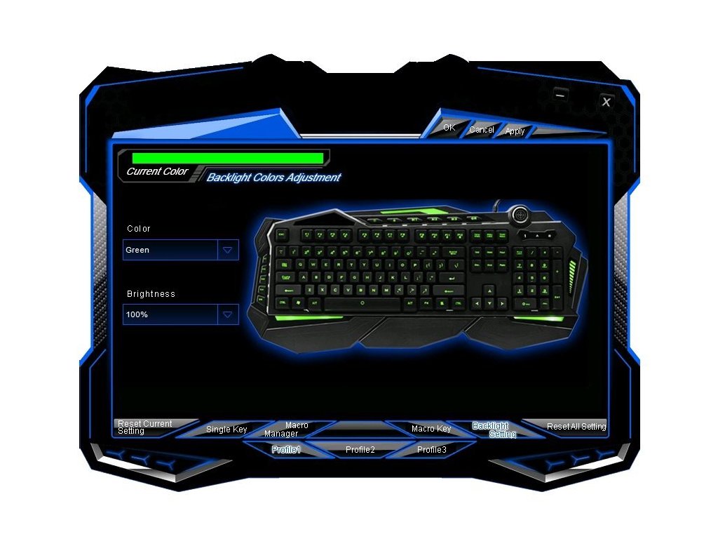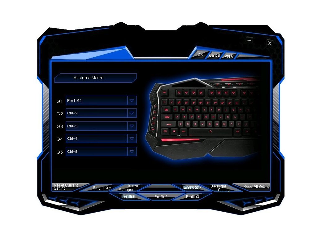 3 profily - na klávesnici naleznete klávesy pro přepínání mezi 3 nezávislými profily. Pro každý profil lze individuelně nastavit barva podsvícení, její intenzita, makra, předefinované klávesy...
