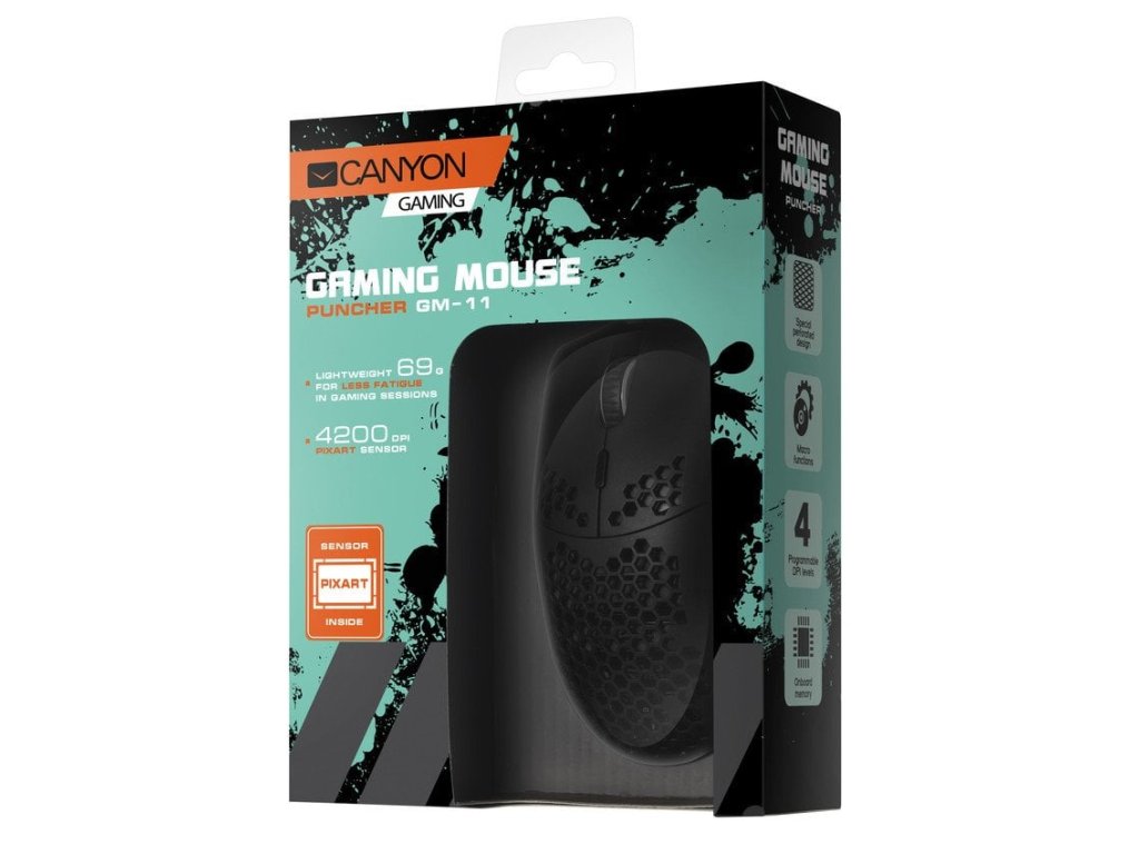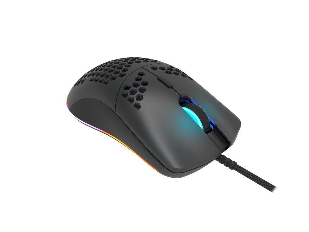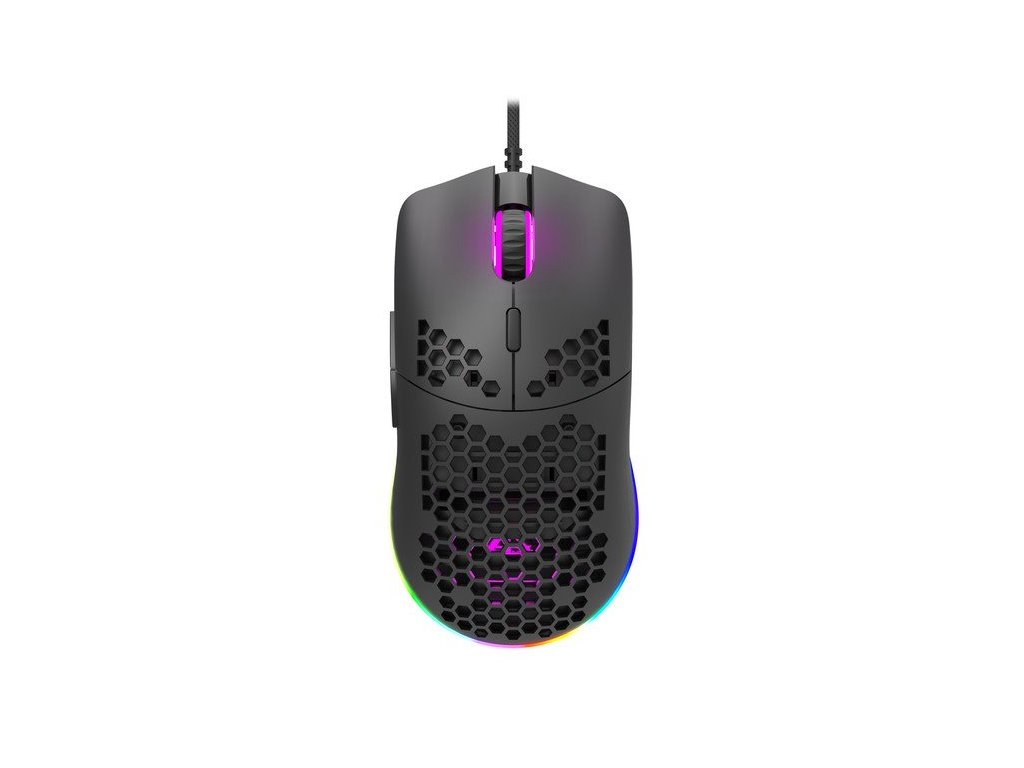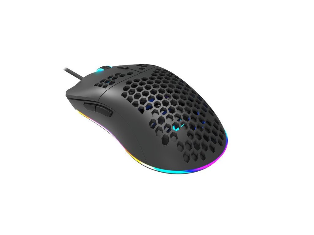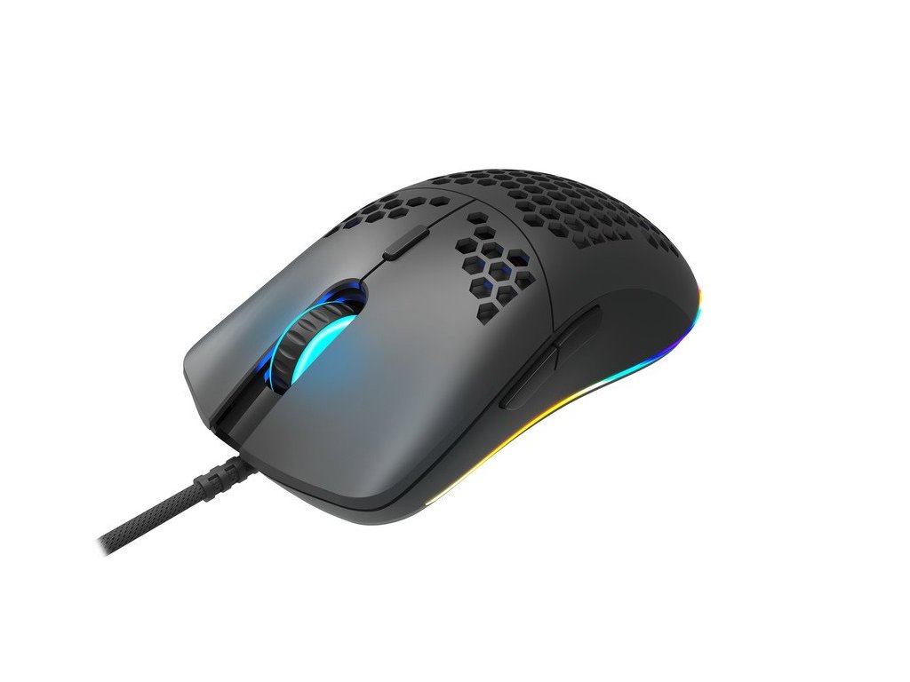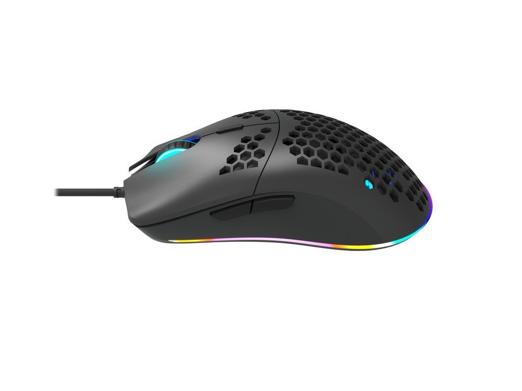 Herní myš Puncher: snímač Pixart PAW3519, nastavitelná DPI 800/1600/2400/4200, 7 programovatelných tlačítek, 6 režimů podsvícení, RGB podsvícení, USB tkaný kabel 1,65 m s feritovým kroužkem, přiřazení maker, vzorkovací frekvence: 125/250/500/1000Hz.
