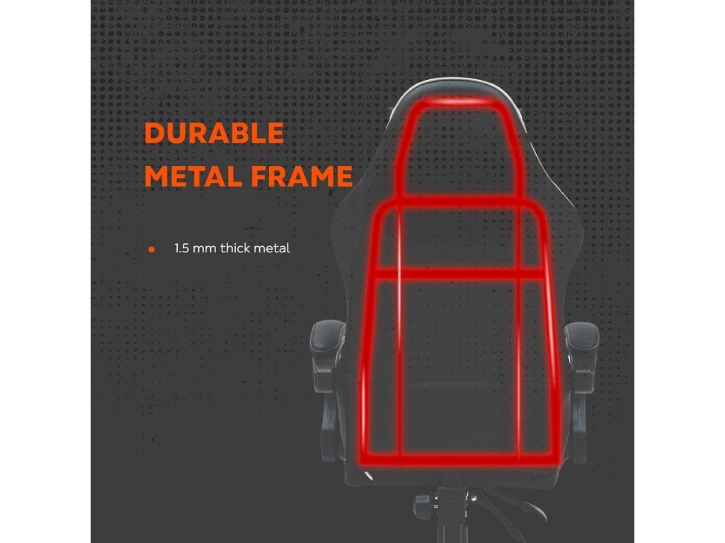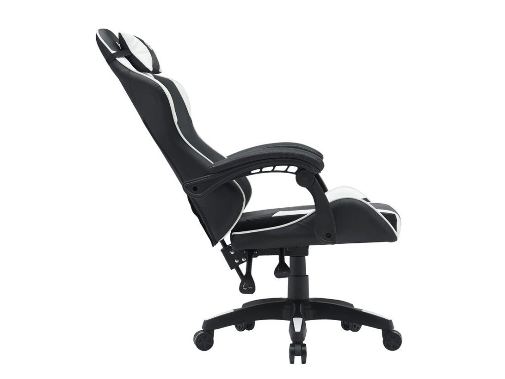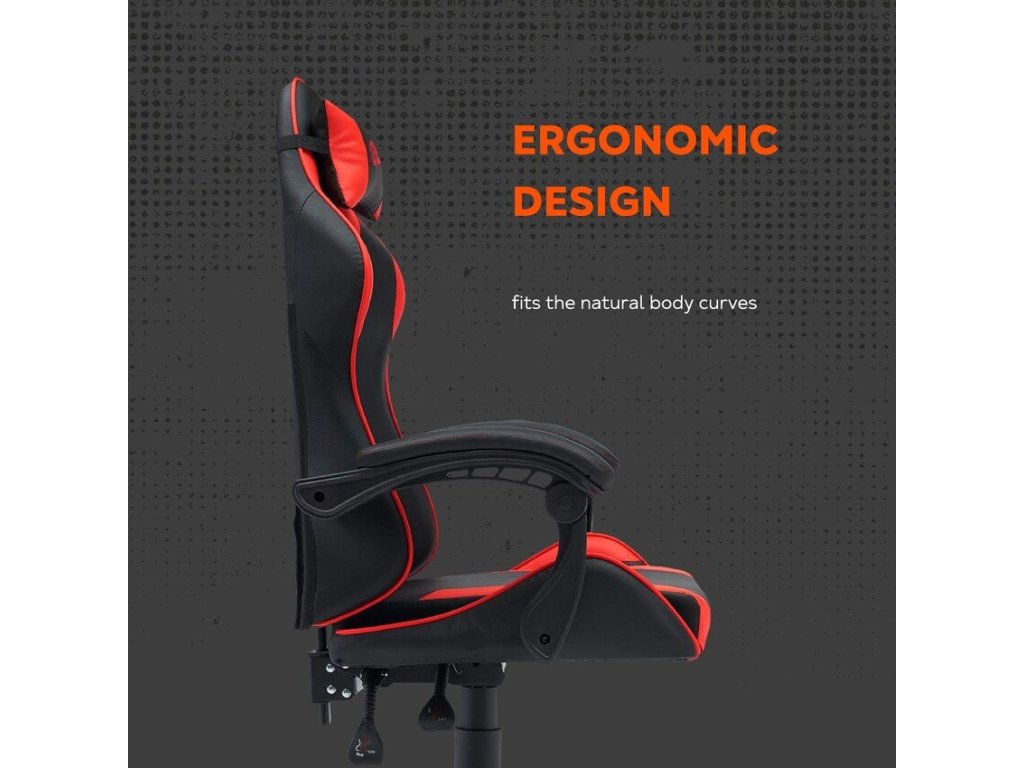 Herní židle • Ergonomická pěna • PU eko kůže • Kovový rám (1,5 mm) • Nastavitelné opěradlo (90–135°) • Nylonová základna • Tichá kolečka • Nosnost 120 kg • Polštáře (hlava, bedra)