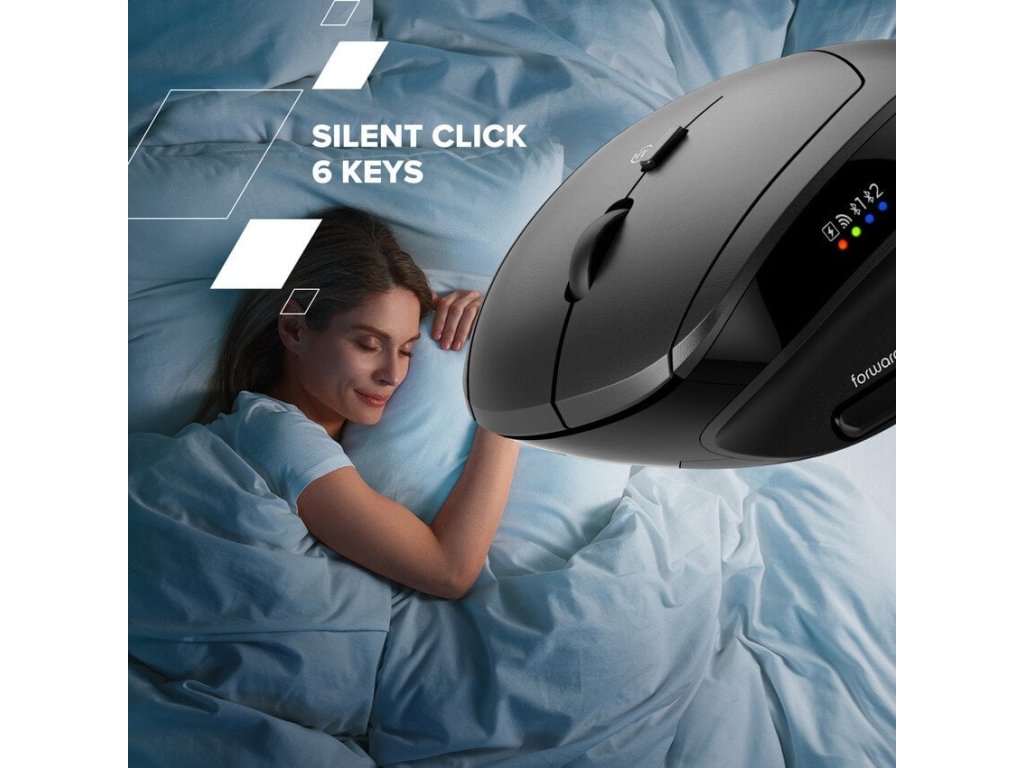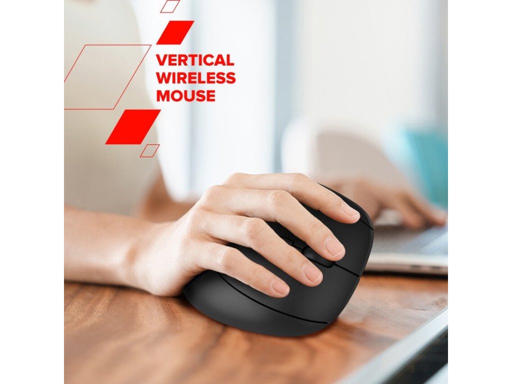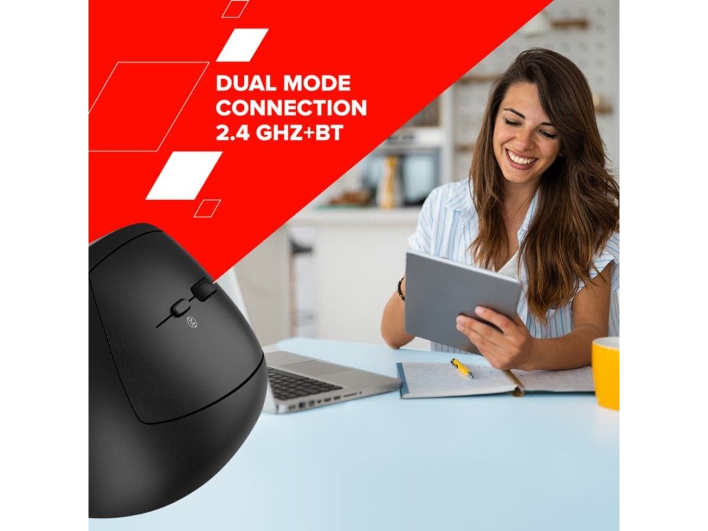 Vertikální ergonomická myš • Duální bezdrátové připojení (2.4GHz / BT) • Snížení namáhání zápěstí • 6 tichých tlačítek • Nastavitelné DPI 800-2400 • Ideální pro dlouhou práci • Napájení 1x AA baterií • Kompaktní a lehká • Indikátor stavu baterie
