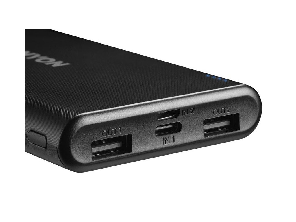 Tato powerbanka se vyznačuje především schopností nabíjení dvou různých zařízení současně pomocí konektorů USB-A. Kromě toho má tato powerbanka kompaktní velikost a stylové zpracování. Už nemusíte střídat nabíjení zařízení nebo přenášení dvou samostatných powerbanek. Svá zařízení můžete také nabíjet pomocí kabelu Micro-USB nebo USB-C. Kapacita baterie postačuje na tři až čtyři nabití moderního smartphonu.