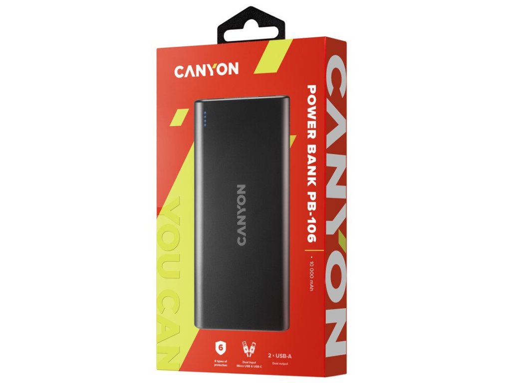 CANYON powerbanka 10000mAh CNE-CPB1006B, 2 vstupy: Micro USB + USB-C, 2 výstupy: 2 * USB-A, vstup: DC 5V / 2 A (Micro-USB / USB-C), výstup: 5V / max. 2,1 A (2x USB-A), kapacita: 10 000 mAh, 6 typů ochrany, LED indikátor – stav baterie