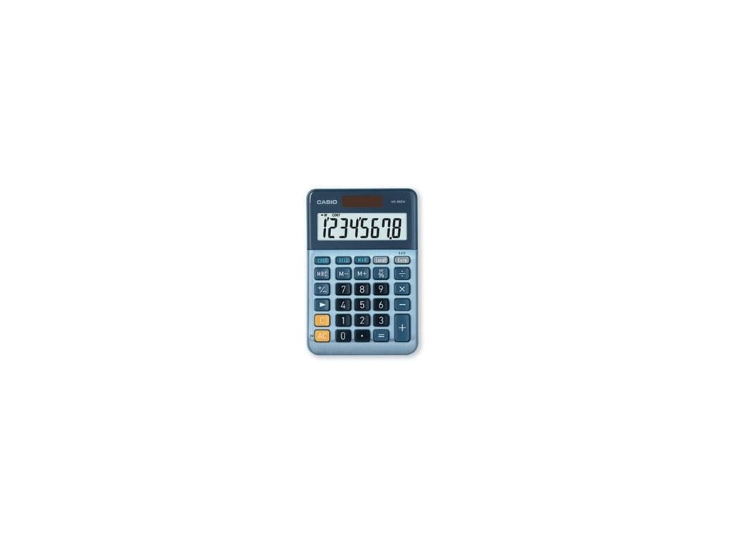 Kalkulačka Casio MS-88 EM disponuje kovovým panelem a ergonomicky tvarovanými plastovými tlačítky. Je vybavena 8místným LCD displejem a duálním napájením (solární + baterie). Umožňuje klasické výpočty, výpočet jmen, procent i změnu znaménka +/-.