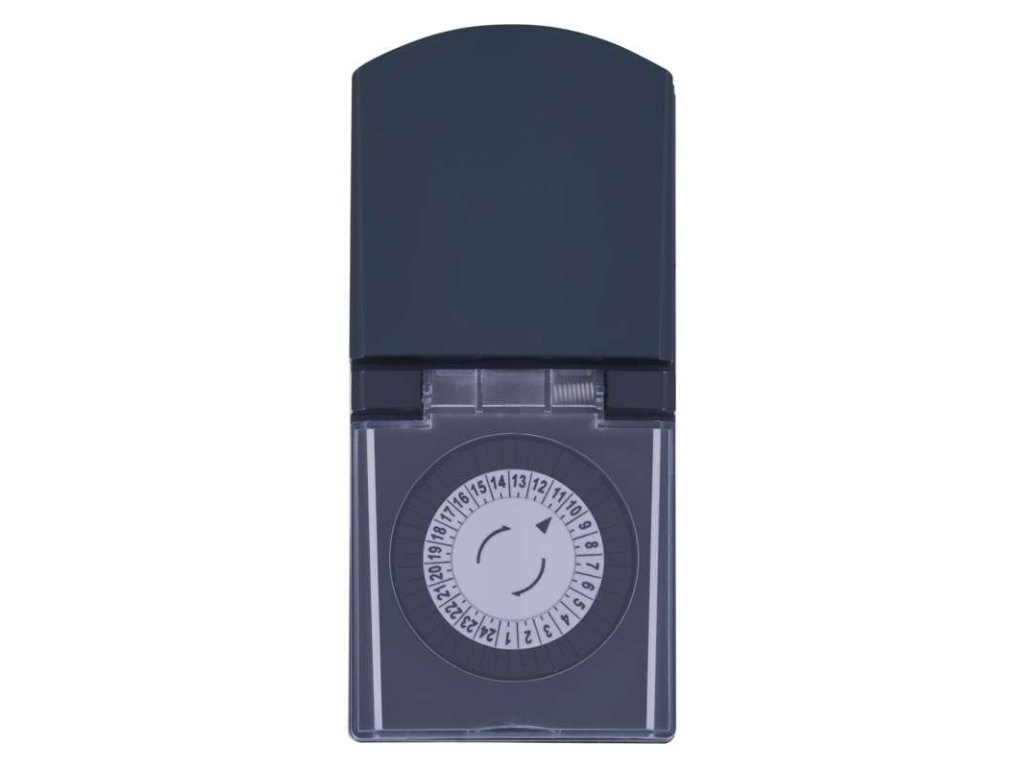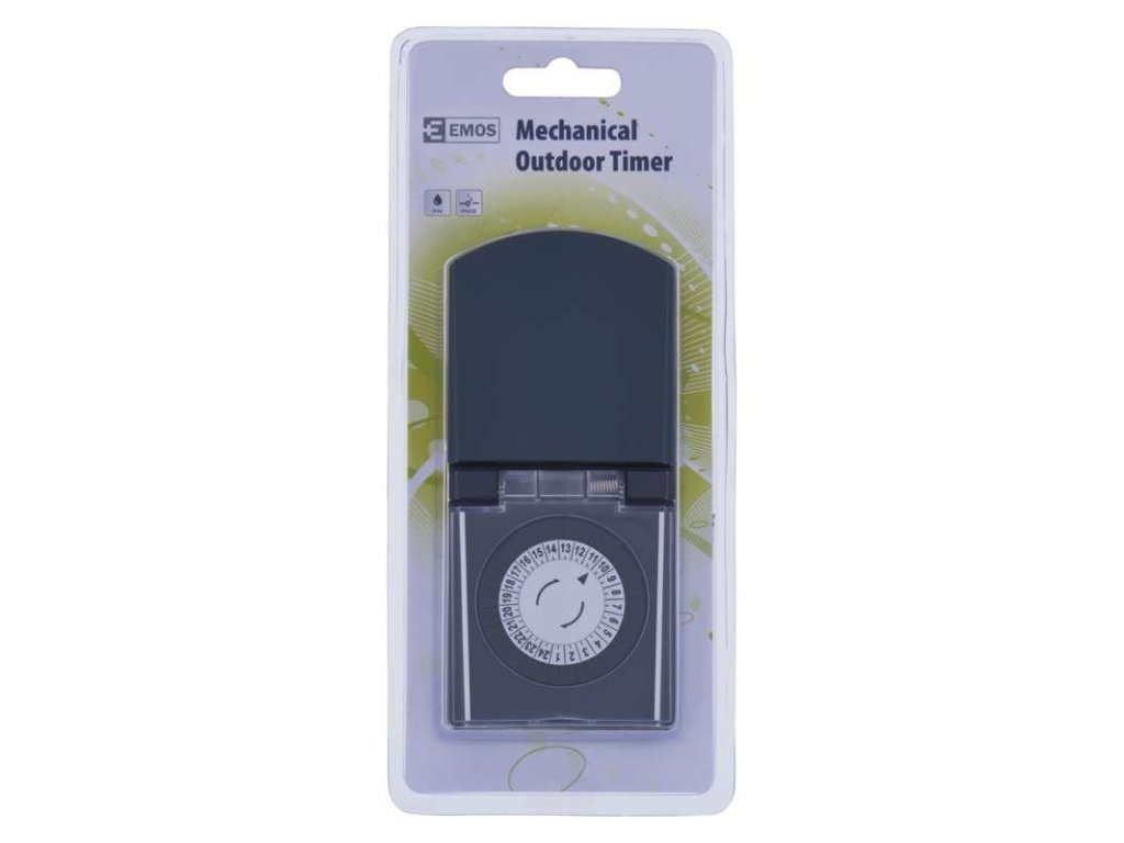 Mechanická spínací zásuvka s 24hodinovým cyklem. Minimální nastavitelný časový úsek je 30 minut. Krytí IP44 umožňuje použití mechanické spínací zásuvky ve venkovních prostorech. Provozní teplota -25 °C do +50 °C.