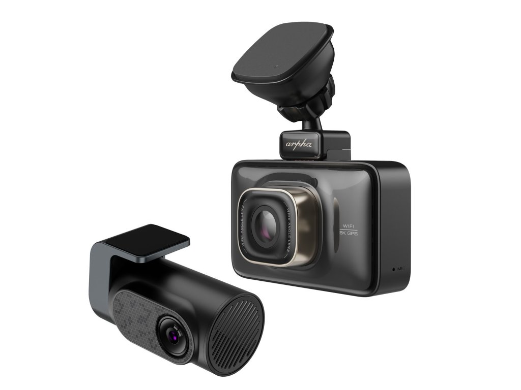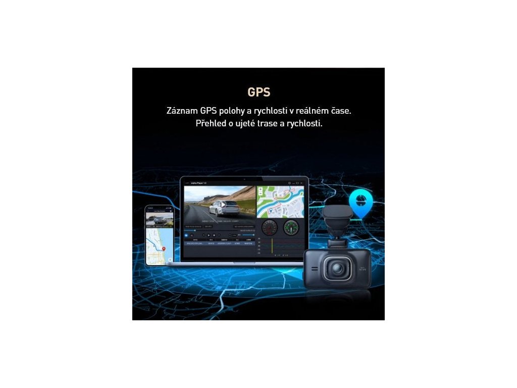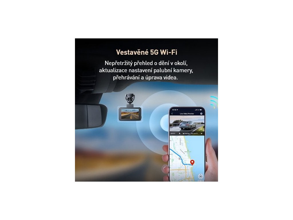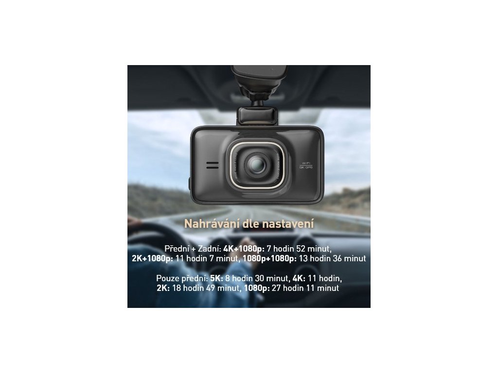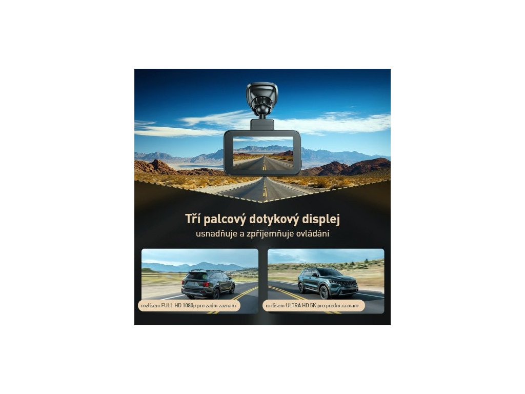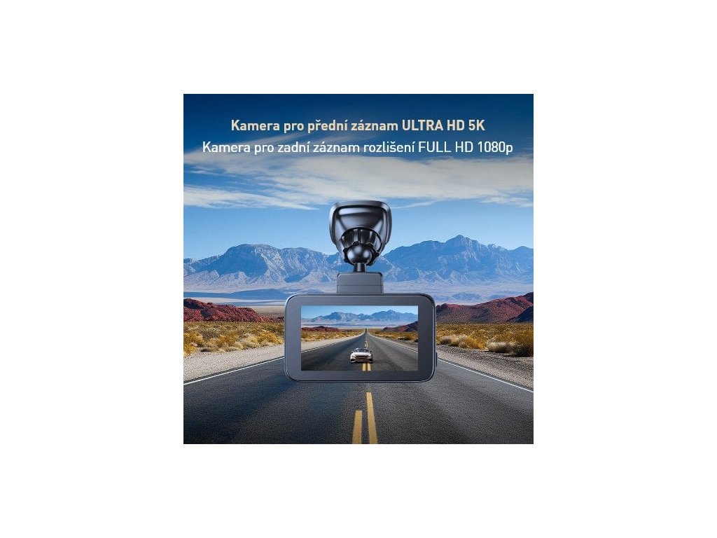 Autokamera s GPS, rozlišení až 5K (přední kamera) nebo 4K + FullHD ve spojení se zadní kamerou, zabudovaná 5GHz Wi-Fi, světelnost objektivu F=1,7, kodek H.265, dotyková obrazovka