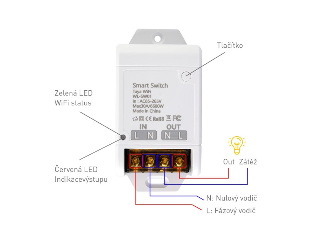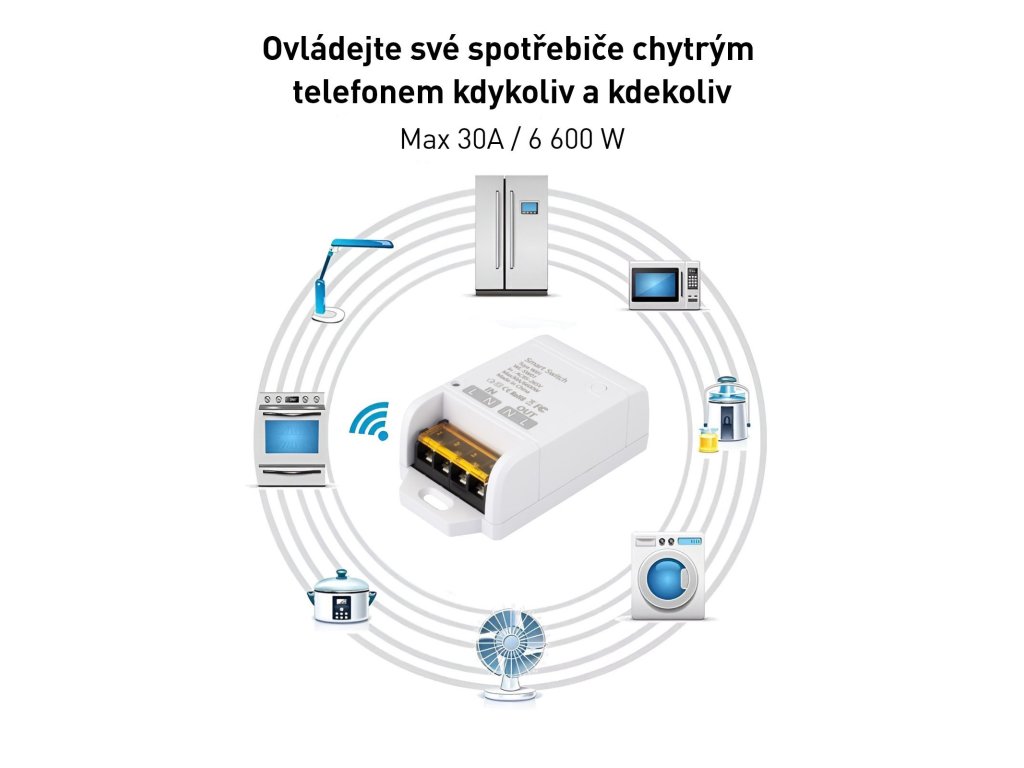Chytrý vypínač, max. zátěž indukční a kapacitní 800W /odporová 30A (6600W), dosah <100m, odolnost IP20