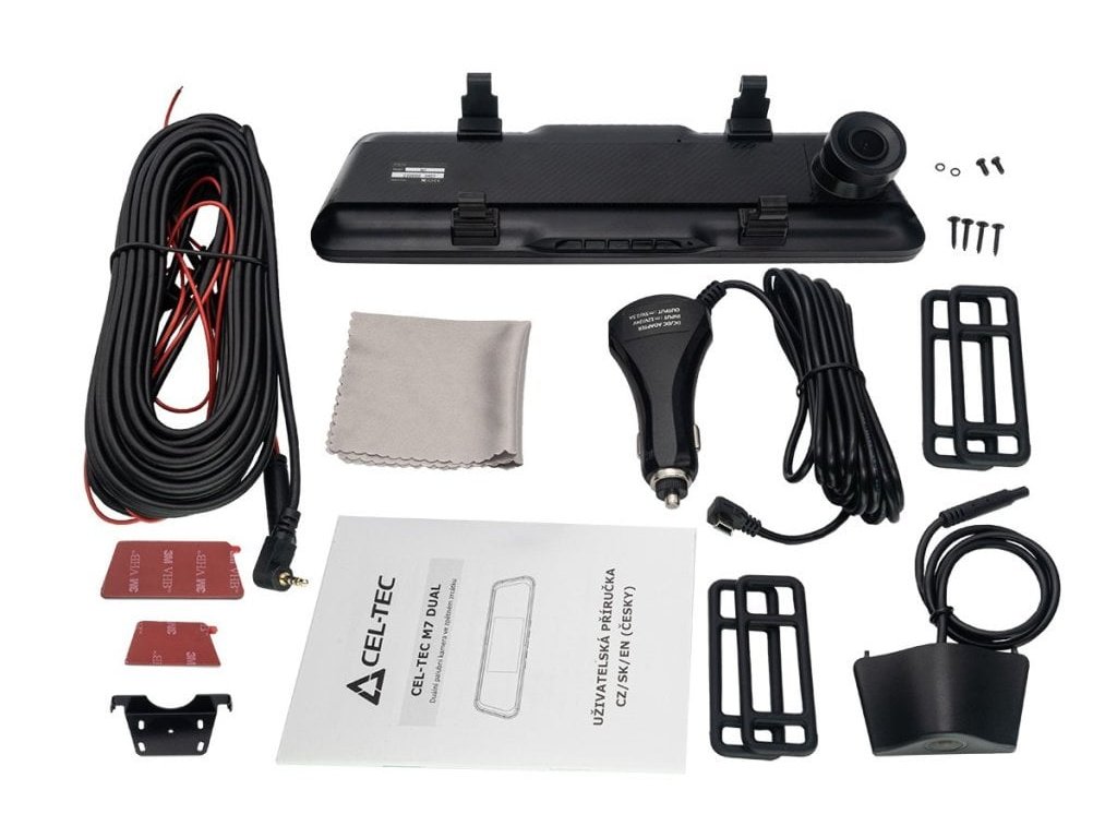 kamera do auta CEL-TEC M7 Dual GPS s přehledným IPS displejem a duálním záznamem ve vysokém rozlišení - přední 2K + zadní FULL HD. Ukládání záznamů ve vysokém rozlišení probíhá na microSD kartu o velikosti až 128 GB