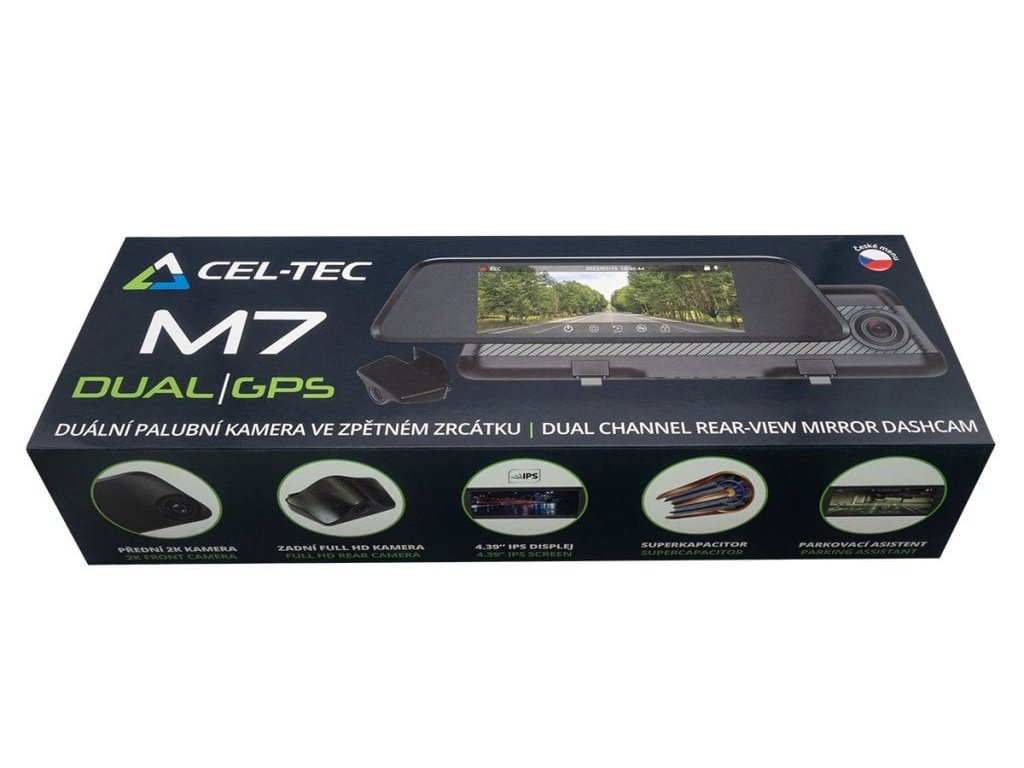 Nová kamera do auta CEL-TEC M7 Dual GPS s přehledným IPS displejem a duálním záznamem ve vysokém rozlišení - přední 2K + zadní FULL HD. Ukládání záznamů ve vysokém rozlišení probíhá na microSD kartu o velikosti až 128 GB, baterii v kameře nahradil moderní superkapacitor. Autokamera podporuje připojení GPS modulu (není součást balení), díky kterému se do záznamu ukládají informace o poloze a rychlosti. Mezi další důležité vlastnosti patří voděodolná ochrana zadní kamery, časosběrný záznam při parkování (nutné dokoupit napájecí sadu - Power Box) a nárazový G-Senzor.