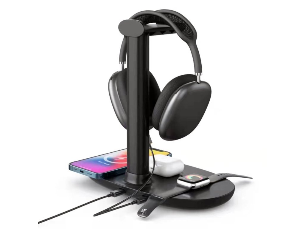 Bezdrátová nabíječka se stojanem na sluchátka, bezdrátové nabíjení (telefon 5W/7,5W/10W/15W; hodinky 2W; sluchátka 3W)