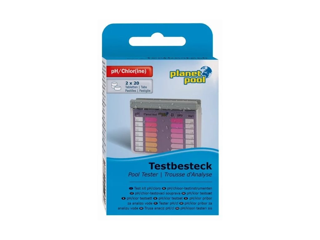 Pomocí této testovací sady rychle a snadno určíte hodnotu pH a koncentrace volného chlóru v bazénové vodě. Použijte tablety Phenol Red ke stanovení hodnoty pH a tablety DPD1 ke stanovení hodnoty koncentrace volného chlóru.