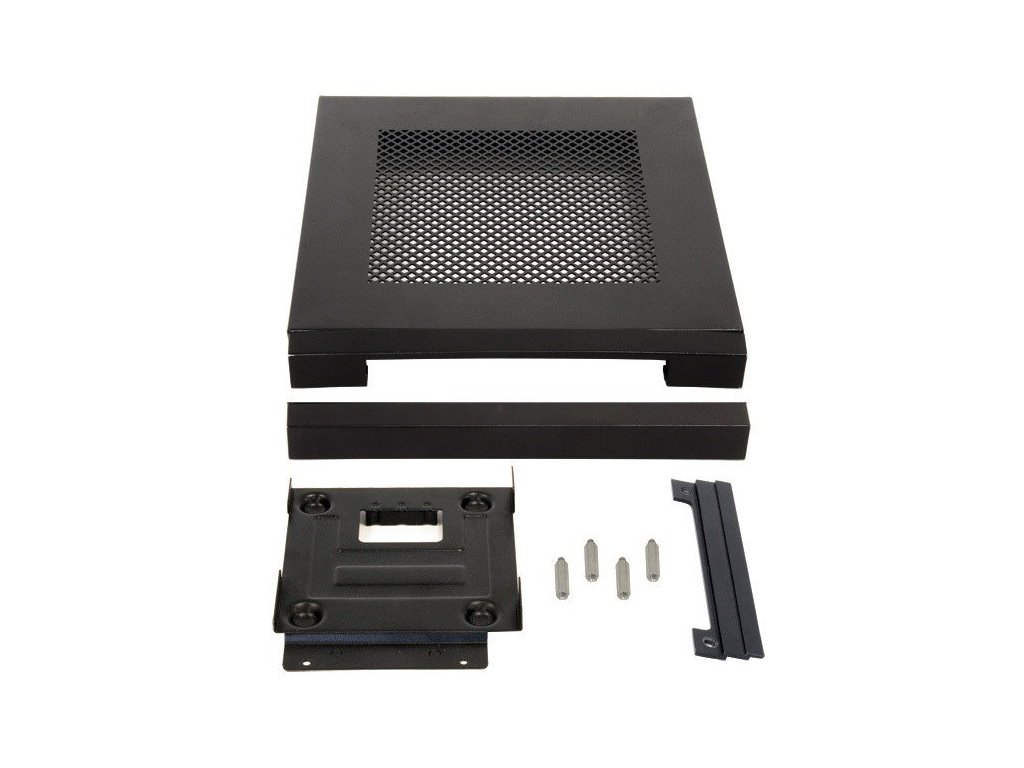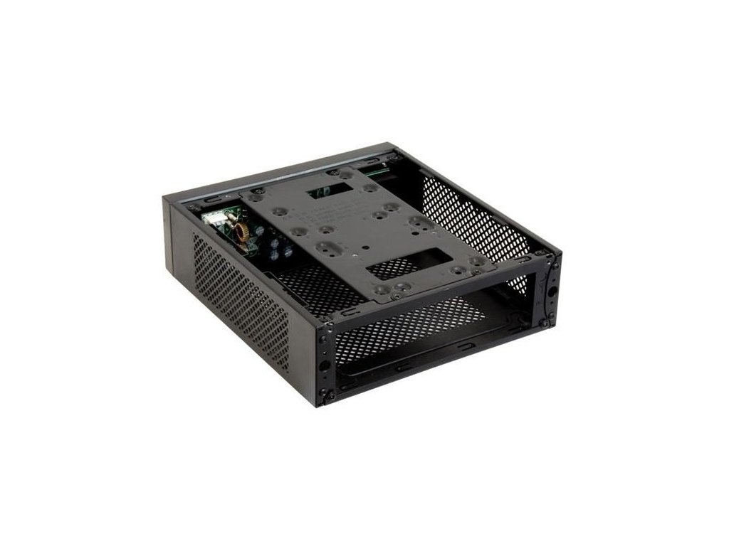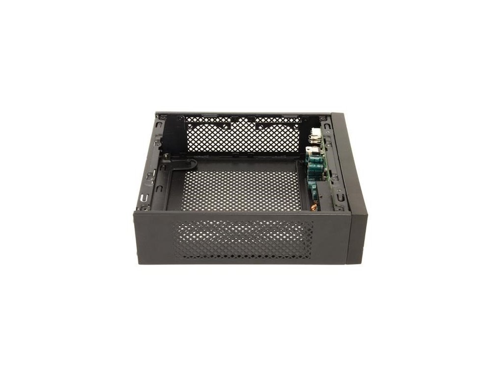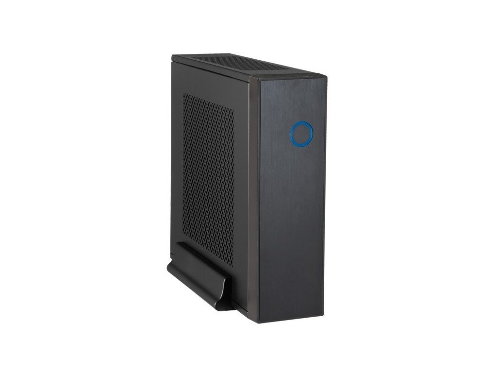 Černá počítačová skříň formátu Mini ITX. Skříň je dodávána bez zdroje.