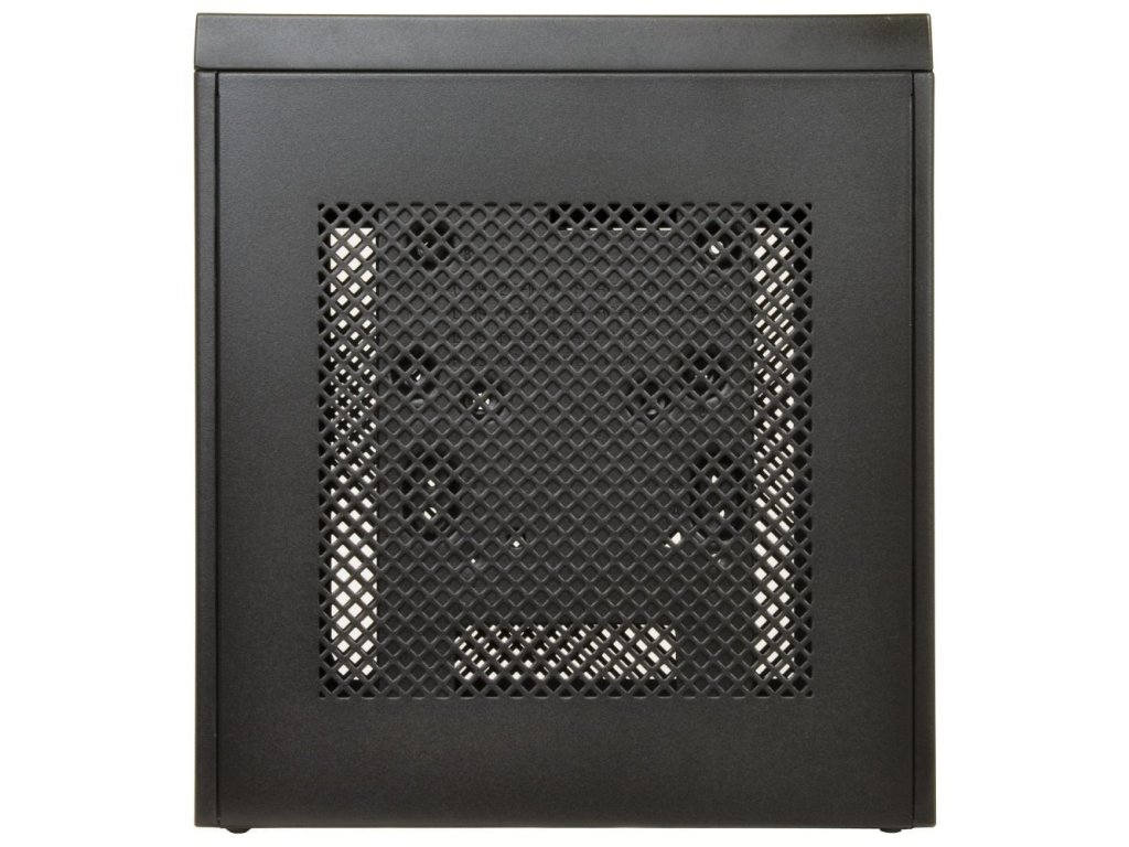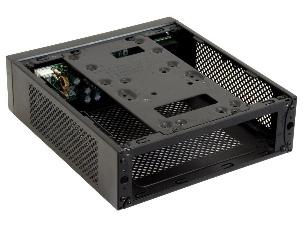 Černá počítačová skříň formátu Mini ITX. Skříň je dodávána se zdrojem s výkonem 120 W.