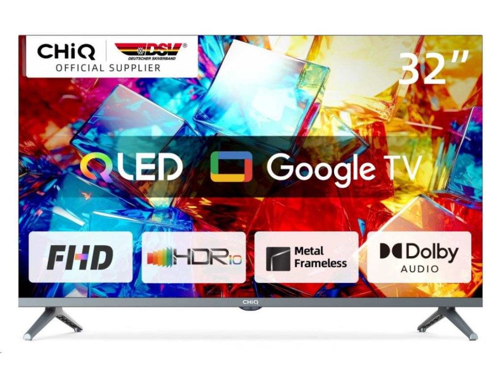CHiQ L32QM8T, 32" (80 cm), bezrámečková Smart QLED Google TV, Full HD, metalický design, Dolby Audio, dbx-tv, HDR 10, HLG, WiFi 2.4/5G, Bluetooth 5.0, webový prohlížeč, Google Assistant, Chromecast, YouTube, Netflix, Prime Video, paměť 1,5G+8G, 2x HDMI