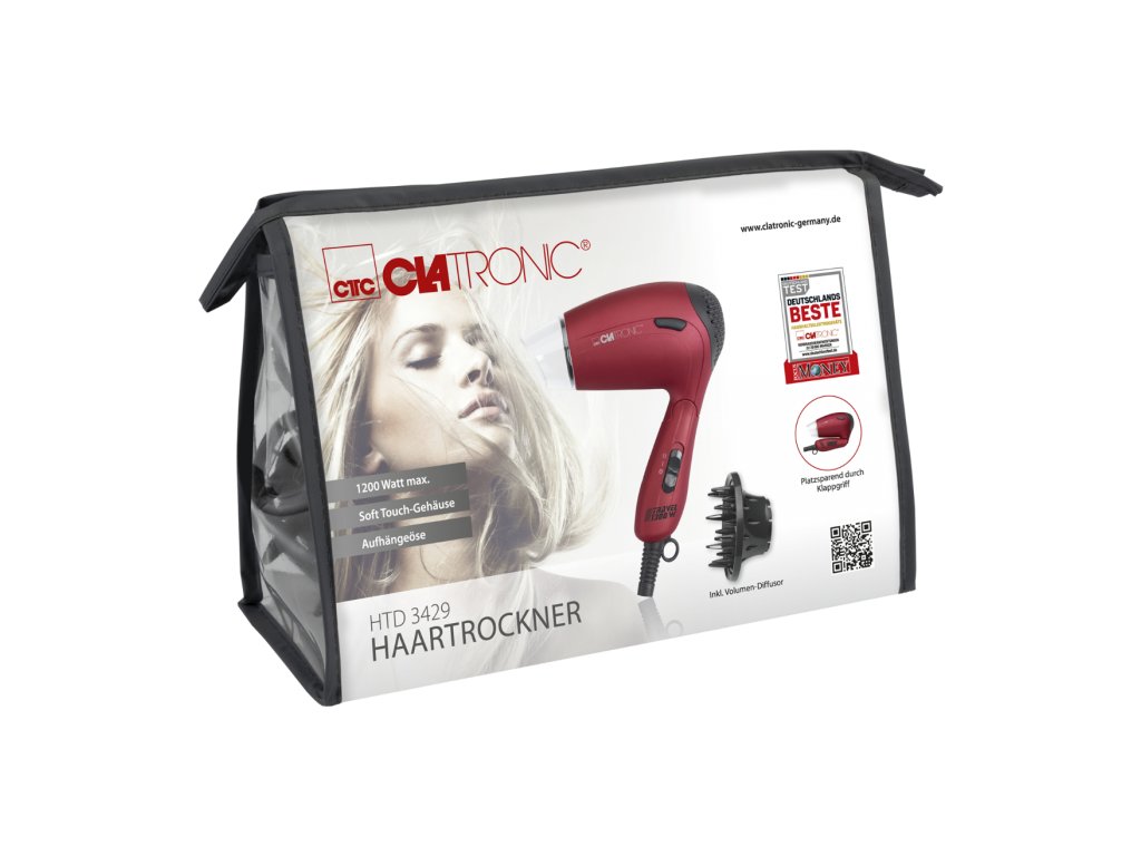 Cestovní fén, 2 rychlosti/teploty, výborný na cestování, sklápěcí rukojeť, měkký protiskluzový materiál, poutko pro zavěšení, difuzér, pouzdro na fén