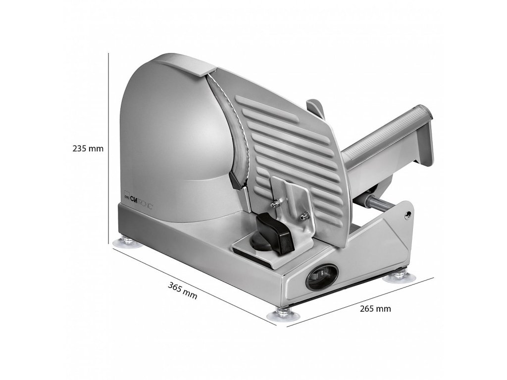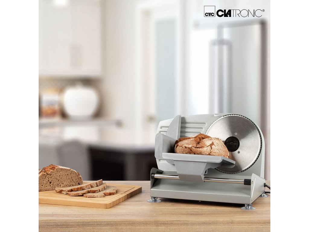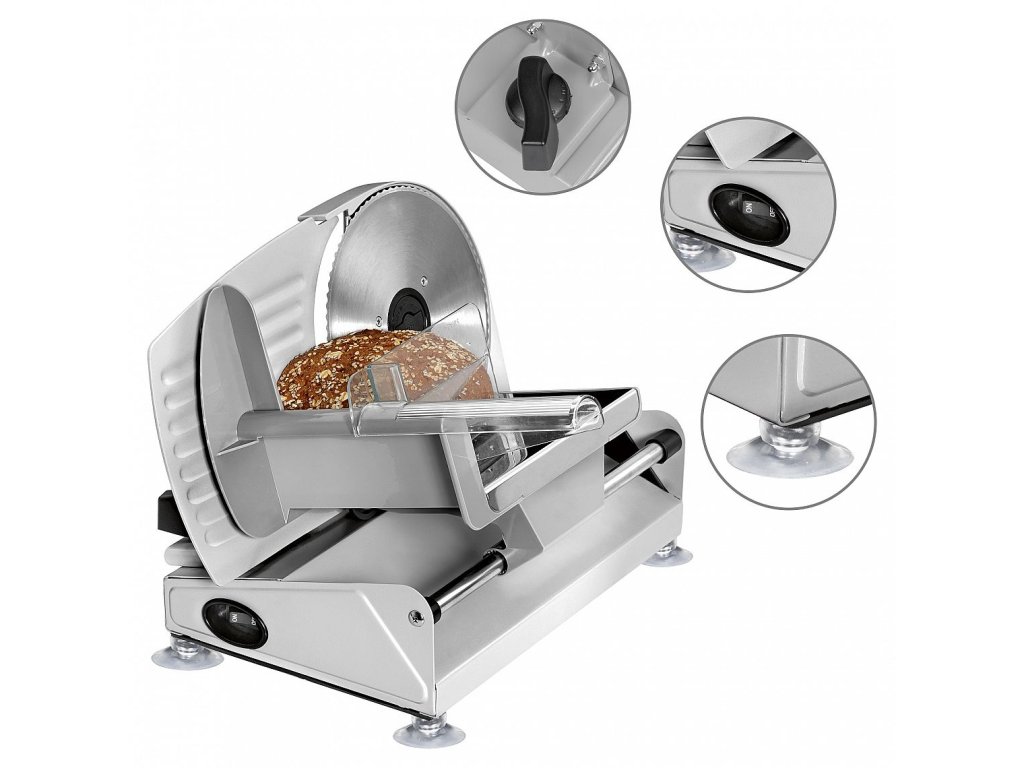 Nerezový kráječ, krájení 0 - 15 mm, 2 stupňový přepínač, vroubkovaný nerezový nůž o průměru 19 cm, přísavné nožičky, rukojeť s ochranou na prsty