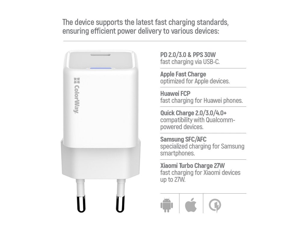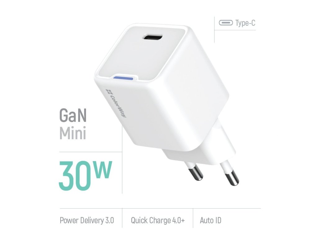ColorWay GaN Mini je moderní, kompaktní a výkonná USB-C nabíječka využívající pokročilou technologii nitridu galia (GaN), která zajišťuje menší rozměry, nižší hmotnost a vyšší účinnost ve srovnání s tradičními adaptéry. S maximálním výkonem 30 W podporuje všechny hlavní rychlonabíjecí protokoly včetně PD 3.0 s PPS, Quick Charge 4.0+ a dalších standardů předních výrobců.