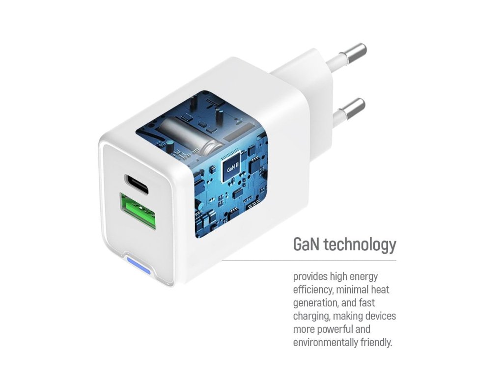 Adaptér využívá moderní GaN technologii, díky které je lehčí, menší a efektivnější než tradiční nabíječky. Produkuje minimální teplo při provozu, spotřebovává méně energie a výrazně zrychluje nabíjení zařízení. Inteligentní čip USB Auto ID automaticky detekuje připojené zařízení a upravuje napětí a proud až do 3 A, čímž zajišťuje maximální účinnost nabíjení.