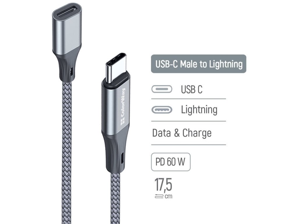 Adaptér, USB-C (M) na Lightning (F), PD až 60W, nylonový oplet, 17,5cm, šedý
