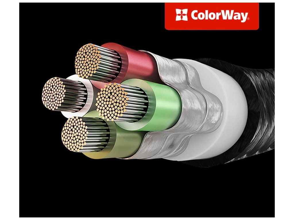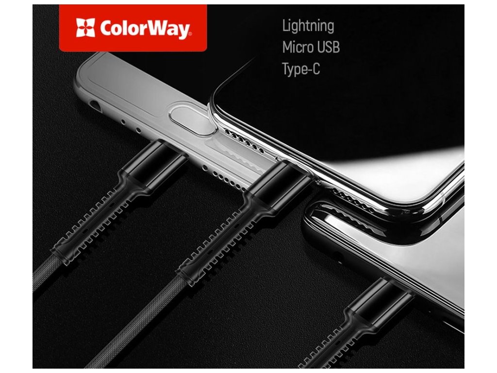 Univerzální kabel Colorway 3v1 pro rychlé nabíjení smartphonů, tabletů a dalších elektronických zařízení, která jsou kompatibilní skrze konektory Lightning, micro USB a USB-C. Poskytuje nejenom rychlé nabíjení, ale také ochranu proti poškození díky nylonové vrstvě, která zabraňuje nadměrnému ohýbání kabelu. Každý z konektorů je opatřen speciálním těsněním, které eliminuje riziko zlomu.