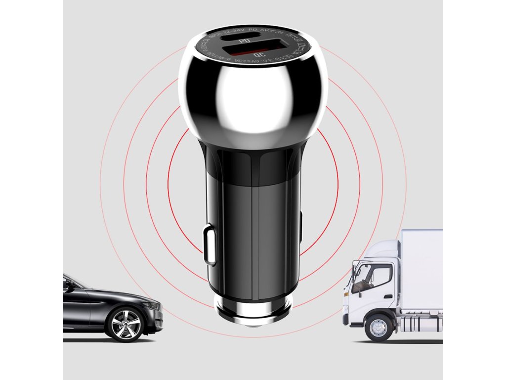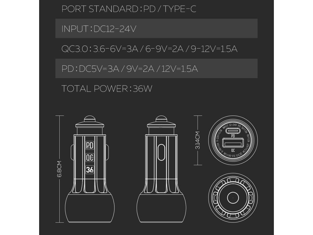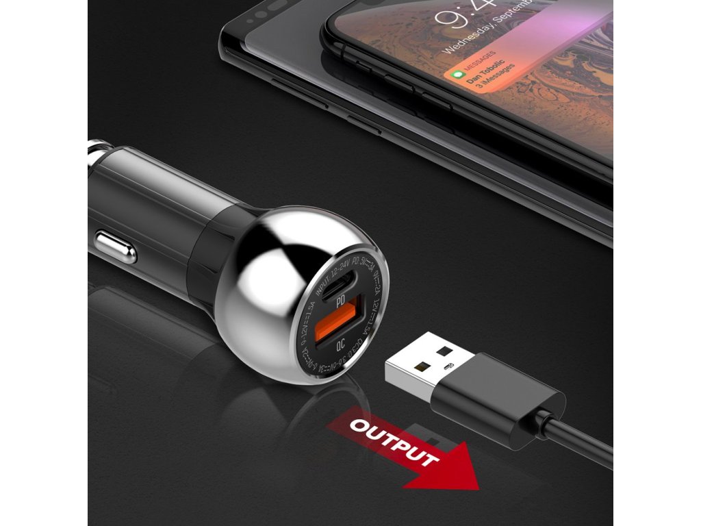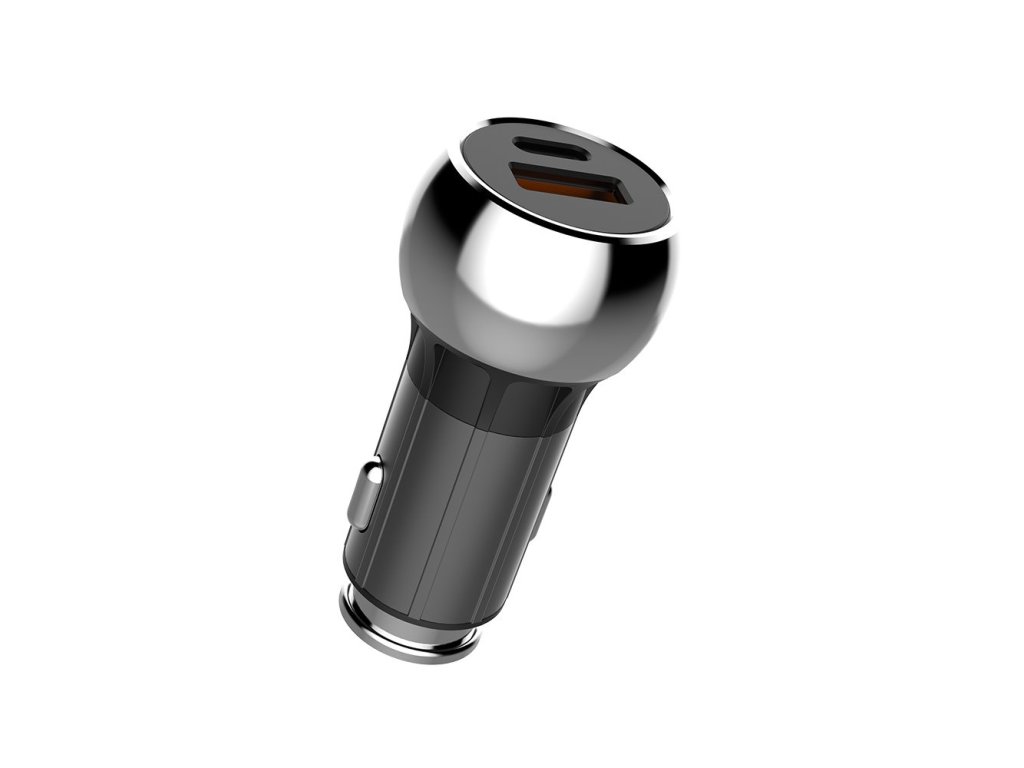 Napájecí adaptér, do auta, 1x USB-A, 1x USB-C, vstup 12-24V, výstup max. 3A, 36W, Power Delivery Port + QC3.0, černo-stříbrná