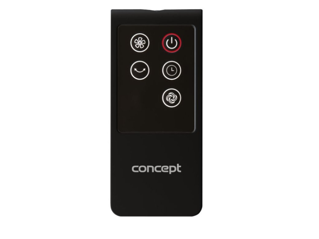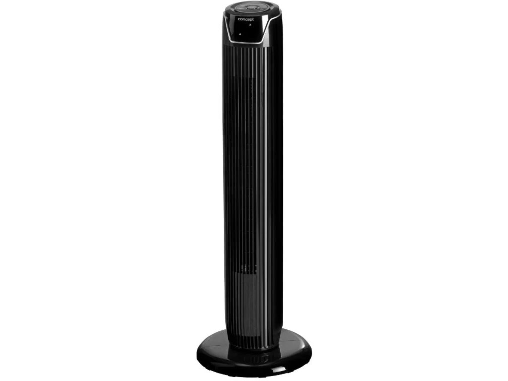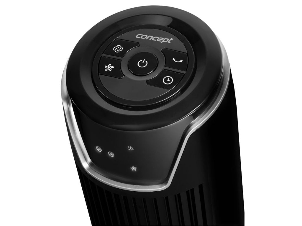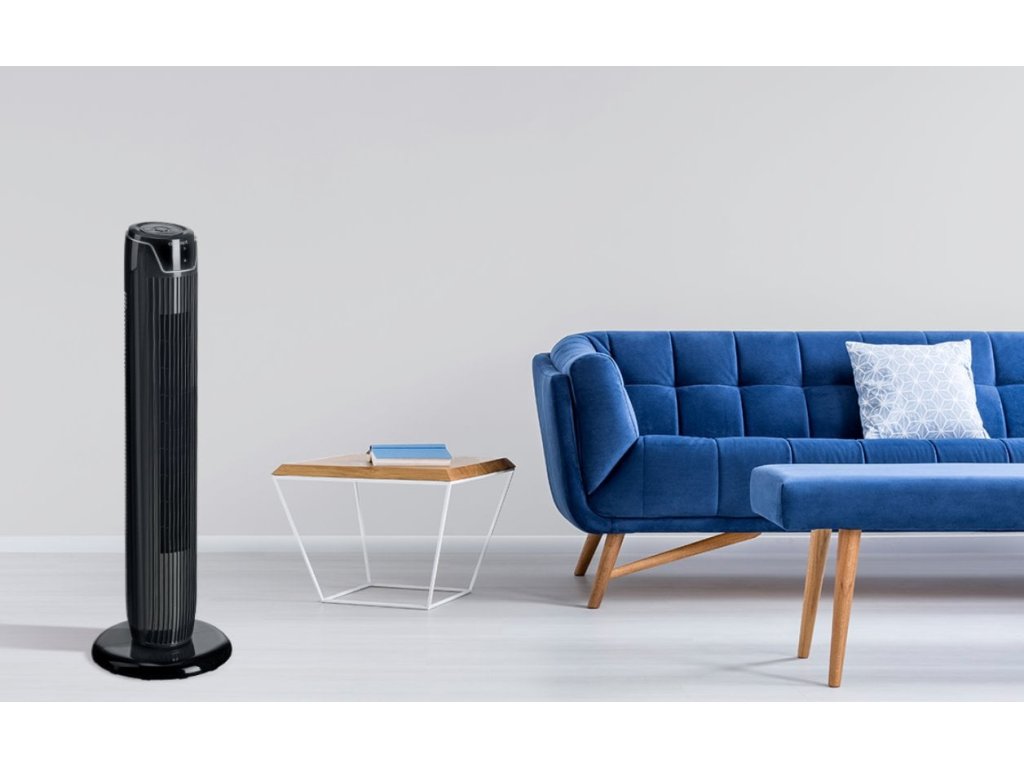 Sloupový ventilátor v černé barvě. Má 3 provozní režimy a 3 rychlosti proudění vzduchu. Ovládat lze dálkovým ovladačem, který je součástí balení.