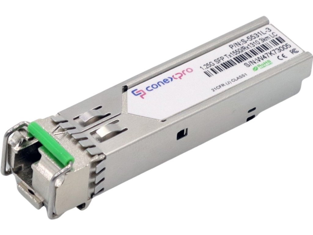 Gigabitový WDM/Bidi Singlemode SFP modul od výrobce Conexpro s vlnovou délkou (Tx/Rx) 1550/1310 nm, rychlostí 1 Gbps, vybavený jedním LC konektorem s UPC broušením a je určený pro spojení na vzdálenost 3 km. Tento modul poskytuje univerzální kompatibilitu, což znamená, že je schopen spolupracovat s téměř všemi dostupnými aktivními prvky. Samozřejmostí je podpora diagnostiky optického spojení pomocí funkce DDM (Digital Diagnostic Monitoring).