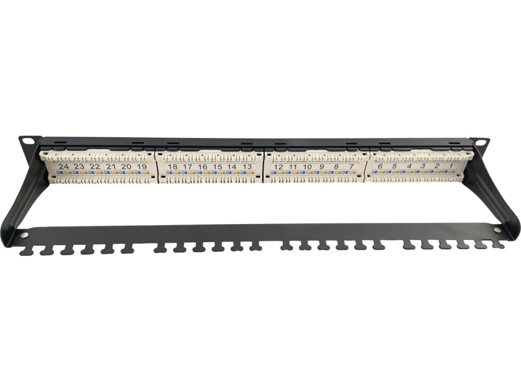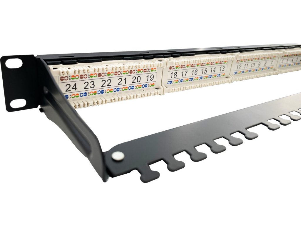 UTP patch panel bez stínění určený pro 19" datové rozvaděče s 24 porty kategorie CAT6A kombinuje spolehlivost a jednoduchou instalaci. S duálními svorkovnicemi typu 110/Krone 8p8c a kovovým provedením nabízí jednoduchou instalaci a stabilní připojení bez elektromagnetických rušení. Černá barva a výška 1U zajišťují kompaktní a estetický design. Odnímatelná vyvazovací lišta na zadní straně usnadňuje instalaci a vedení kabelů. Panel má celkovou hloubku 130 mm s lištou, 29 mm bez ní a v balení nechybí ani racková sada pro přichycení do datového rozvaděče.
