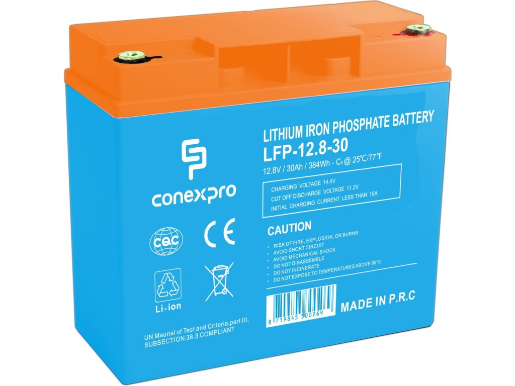 LiFePO4 baterie značky Conexpro s výstupním napětím 12,8 V, kapacitou 30 Ah (384 Wh), až 5x delší životností než u olověné baterie, dvěma M5 konektory pro připojení k zařízení a inteligentním Battery Management Systémem (BMS) pro řízení nabíjení a poskytování informací pomocí Bluetooth. Baterie této řady je vhodná pro celou řadu použití, od nasazení k pohonu lodí a člunů, jako trvanlivý zdroj energie v karavanech, jachtách, ostrovních fotovoltaických systémech, elektromobilitě nebo v prostředí s nízkými teplotami.