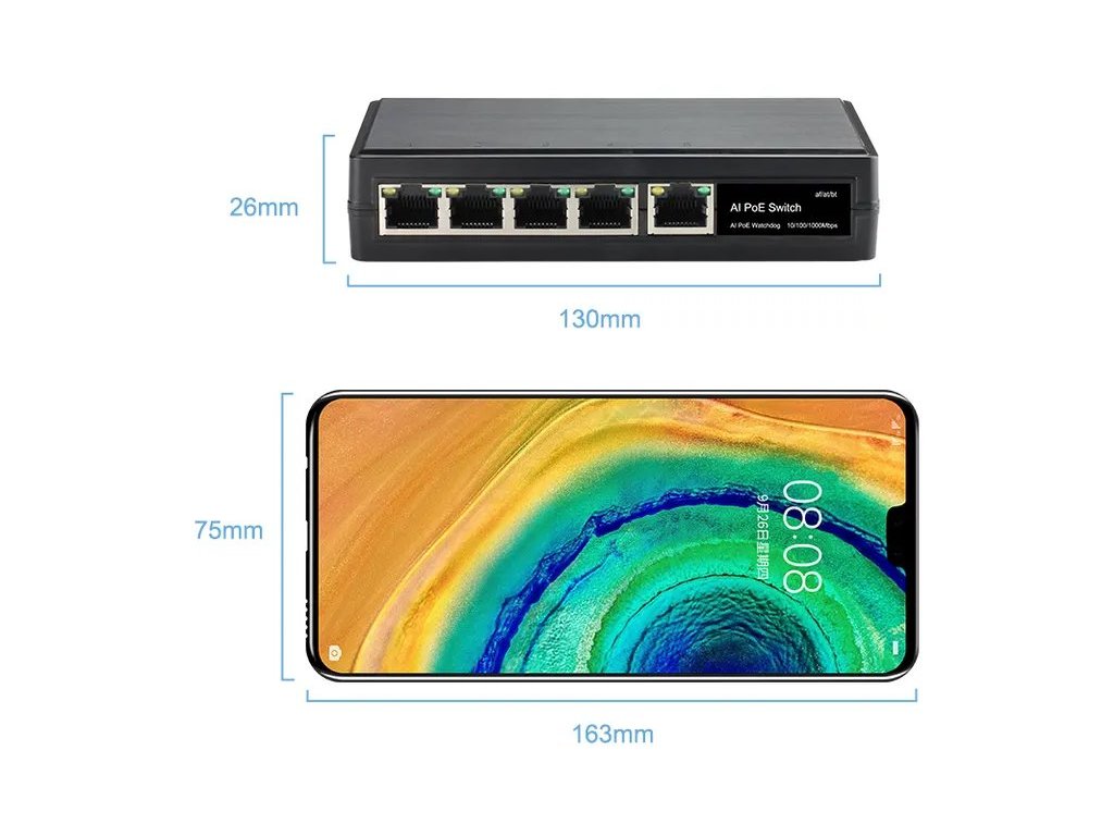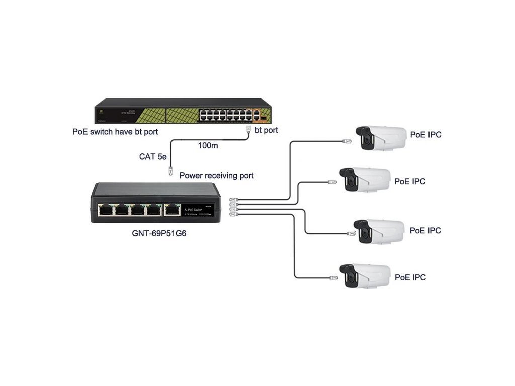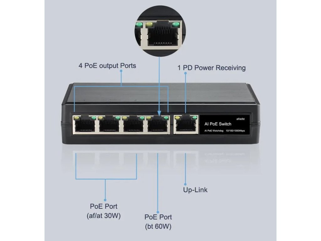 Gigabitový PoE switch s venkovním boxem, napájený pouze přes PoE, bez managementu a s 5x Gigabit porty je zařízení určeno do míst bez napájení a je vhodný pro napájení až 4 zařízení (kamer / Wi-Fi AP). Switch nabízí tichý bezventilátorový chod, 5x 10/100/1000 Mbps z čehož 4 LAN porty podporují funci PoE (802.3af/at, 30 W / port, port č.4 podporuje dokonce 802.3af/at/bt - 60 W / port) s celkovým PoE budgetem 60 W (záleží na vstupním napájení), nízkou vnitřní spotřebu a napájením pouze přes PoE (802.3at/bt).