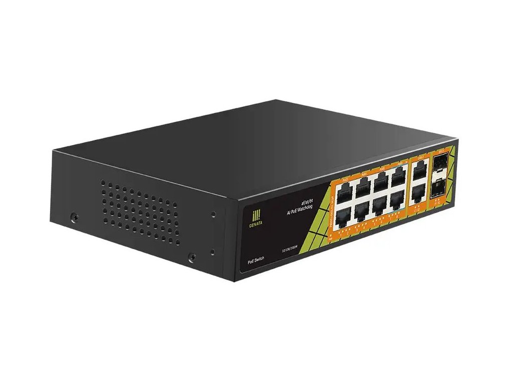 Gigabitový PoE switch v kovovém šasi, bez managementu s 10x Gigabit LAN porty a dvěma Gigabit SFP je zařízení určeno do míst s optickým přívodem a je vhodný pro napájení až 8 zařízení (kamer / Wi-Fi AP). Switch nabízí tichý bezventilátorový chod, 10x 10/100/1000 Mbps + 2x Gigabitové SFP uplinky z čehož 8 LAN portů podporuje funkci PoE (802.3af/at, 30 W / port, porty č.7 a 8 podporuje dokonce 802.3af/at/bt - 60 W / port) s celkovým PoE budgetem 120 W, nízkou vnitřní spotřebou a napájením přes 230V AC konektor díky věstavěnému zdroji.