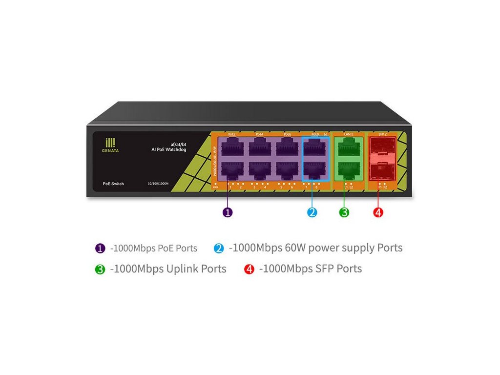(6) 802.3af/at PoE (30 W / port) + (2) 802.3af/at/bt PoE (60 W / port)