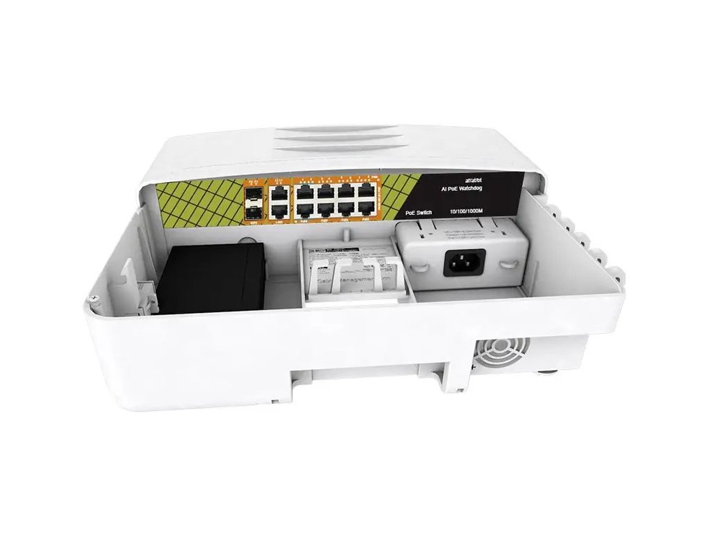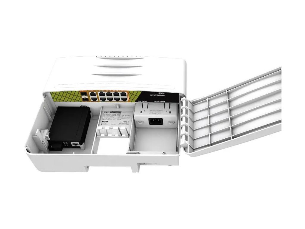 Gigabitový PoE switch ukrytý spolu se zdrojem ve venkovním šasi, krytím IP65, bez managementu, s 10x Gigabit porty je ideální PoE switch pro venkovní instalace a napájení až 8 zařízení (kamer / Wi-Fi AP). Switch nabízí tichý bezventilátorový chod, 10x 10/100/1000 Mbps + 2x Gigabit SFP uplink z čehož všech 8 portů podporuje funci PoE (802.3af/at, 30 W / port, port č.1 a 2 podporuje dokonce 802.3af/at/bt - 60 W / port) s celkovým PoE budgetem 120 W a napájením přes 230V AC konektor díky věstavěnému zdroji. Celé venkovní šasi lze přidělat na zeď, případně na stožár kovovými stahovacími pásky.