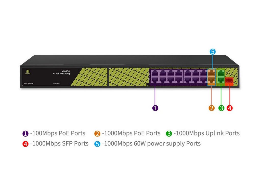 (14) 802.3af/at PoE (30 W / port) + (2) 802.3af/at/bt PoE (60 W / port)