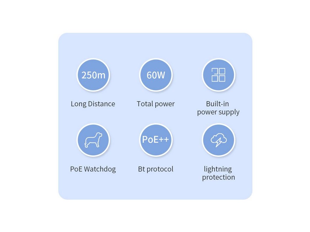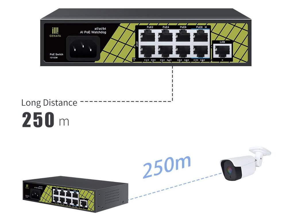 Fast ethernetový kovový PoE switch bez managementu s jedním uplink portem je ideální PoE switch do domácností a rodinných domů pro napájení až 8 zařízení (kamer / Wi-Fi AP) s nízkou spotřebou. Switch nabízí tichý bezventilátorový chod, 9x 10/100 Mbps LAN z čehož 8 ethernetových portů podporuje funkci PoE (802.3af/at, 30 W / port, porty 7 a 8 podporují i 802.3af/at/bt - 60 W / port) s celkovým PoE budgetem 120 W, nízkou vnitřní spotřebou a napájením přes 230V AC konektor díky věstavěnému zdroji. Switch zvládne napájet zařízení až na vzdálenost 250 m při snížení linkové rychlosti na 10 Mbps.
