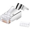 Skládaný stíněný konektor RJ45 s instalační vložkou včetně kovového uchycení přívodního kabelu od značky Conexpro je navržen pro použití s STP/FTP kabelem třídy CAT6A s vodiči typu drát. Tyto konektory jsou nedílnou součástí strukturované kabeláže a jsou pečlivě navrženy tak, aby zajišťovaly bezproblémové spojení mezi kontakty konektoru a měděnými vodiči datového kabelu se zapojením 8p8c. Kontakty konektorů jsou pokryty 50µ zlatem, což zvyšuje jejich odolnost a spolehlivost.