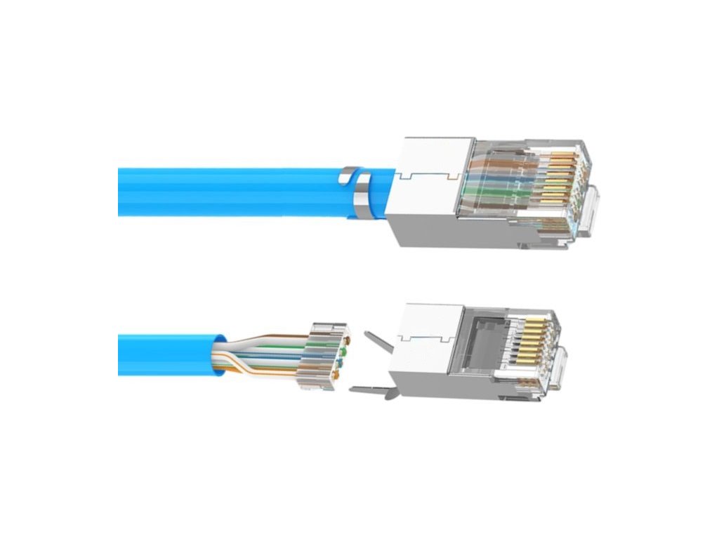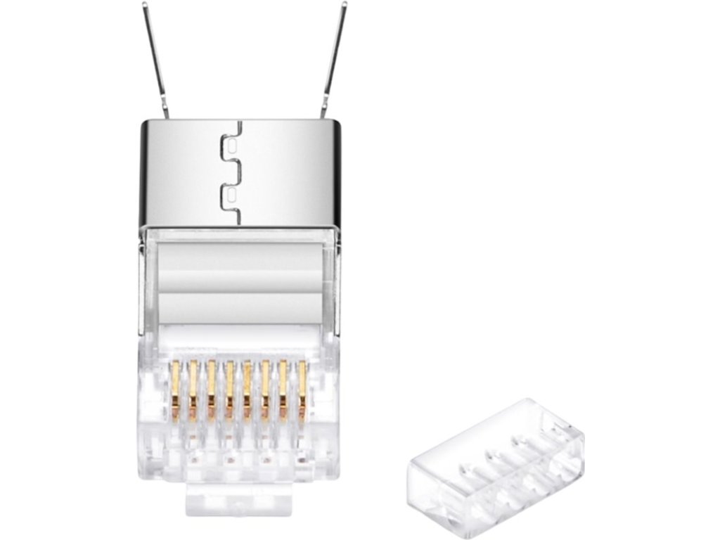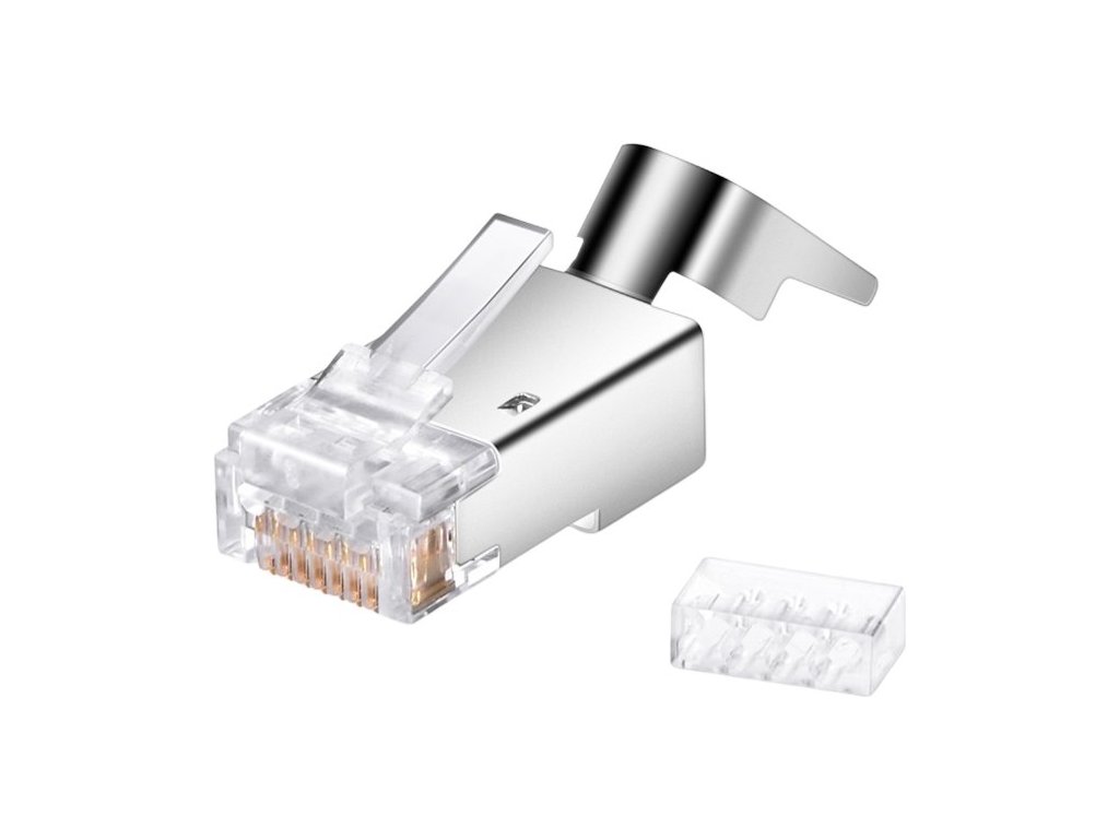 Skládaný stíněný konektor RJ45 s instalační vložkou včetně kovového uchycení přívodního kabelu od značky Conexpro je navržen pro použití s STP/FTP kabelem třídy CAT6A s vodiči typu drát. Tyto konektory jsou nedílnou součástí strukturované kabeláže a jsou pečlivě navrženy tak, aby zajišťovaly bezproblémové spojení mezi kontakty konektoru a měděnými vodiči datového kabelu se zapojením 8p8c. Kontakty konektorů jsou pokryty 50µ zlatem, což zvyšuje jejich odolnost a spolehlivost.