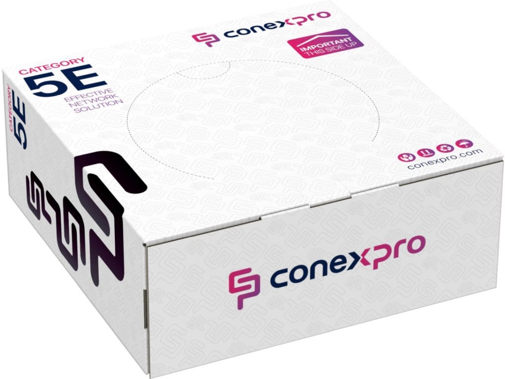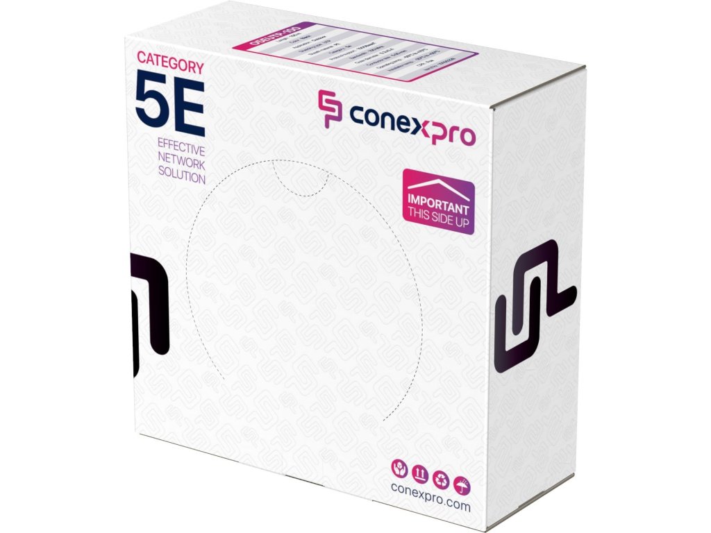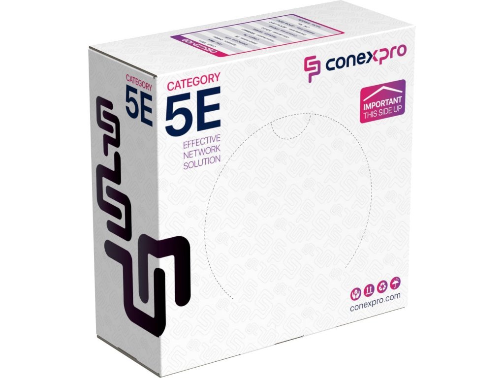 UTP kabel kategorie 5e značky Conexpro je navržen pro venkovní rozvody strukturované kabeláže a bez problémů splňuje mezinárodní standardy včetně všech aktuálních dodatků. Kabel umožňuje přenos dat rychlostí až 1 Gbps (1000 Base-T). Kabel je vyráběn v černé barvě bez stínění s PE pláštěm pro náročnější instalace. Vodiče jsou z kvalitního měděného drátu o průřezu AWG24. Kabel je balen do opravdu kompaktní kartonové krabice s moderním designem a je označen po každém metru od 0 do 100 m.