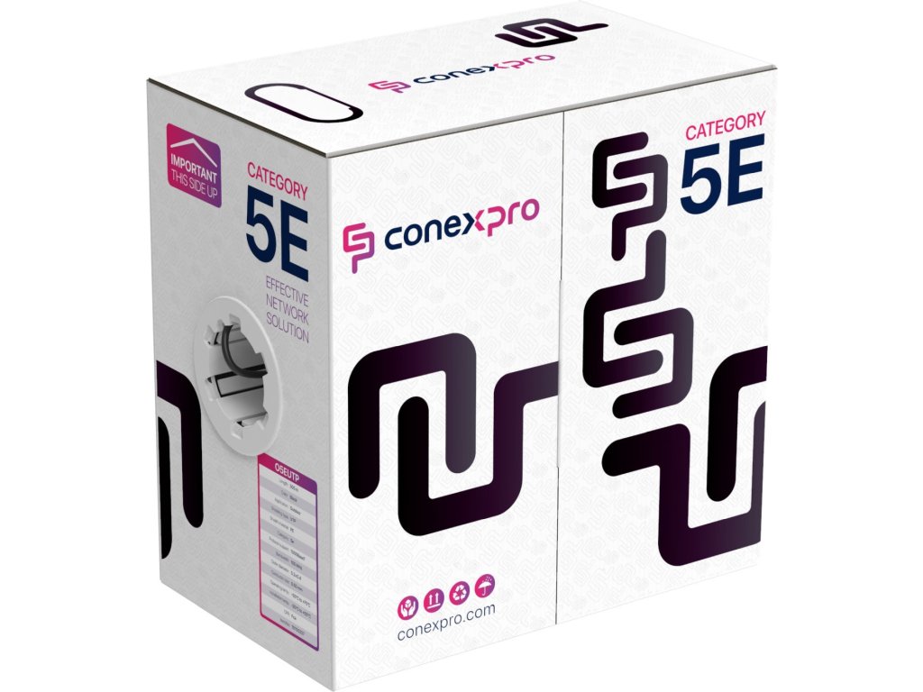 UTP kabel kategorie 5e značky Conexpro je navržen pro venkovní rozvody strukturované kabeláže a bez problémů splňuje mezinárodní standardy včetně všech aktuálních dodatků. Kabel umožňuje přenos dat rychlostí až 1 Gbps (1000 Base-T). Kabel je vyráběn v černé barvě bez stínění s PE pláštěm pro náročnější instalace. Vodiče jsou z kvalitního měděného drátu o průřezu AWG24. Kabel je balen do kvalitní kartonové krabice s moderním designem a je označen po každém metru od 0 do 305 m.