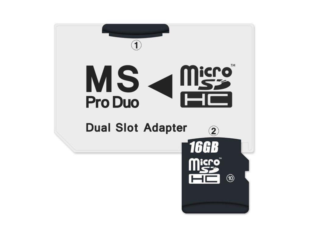 redukce až dvou microSD karet na kartu MS Pro Duo, pro použití v zařízeních podporujících pouze karty MS Pro Duo