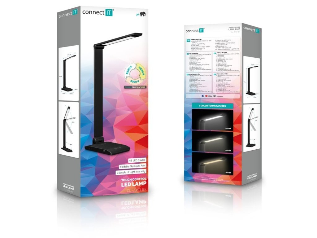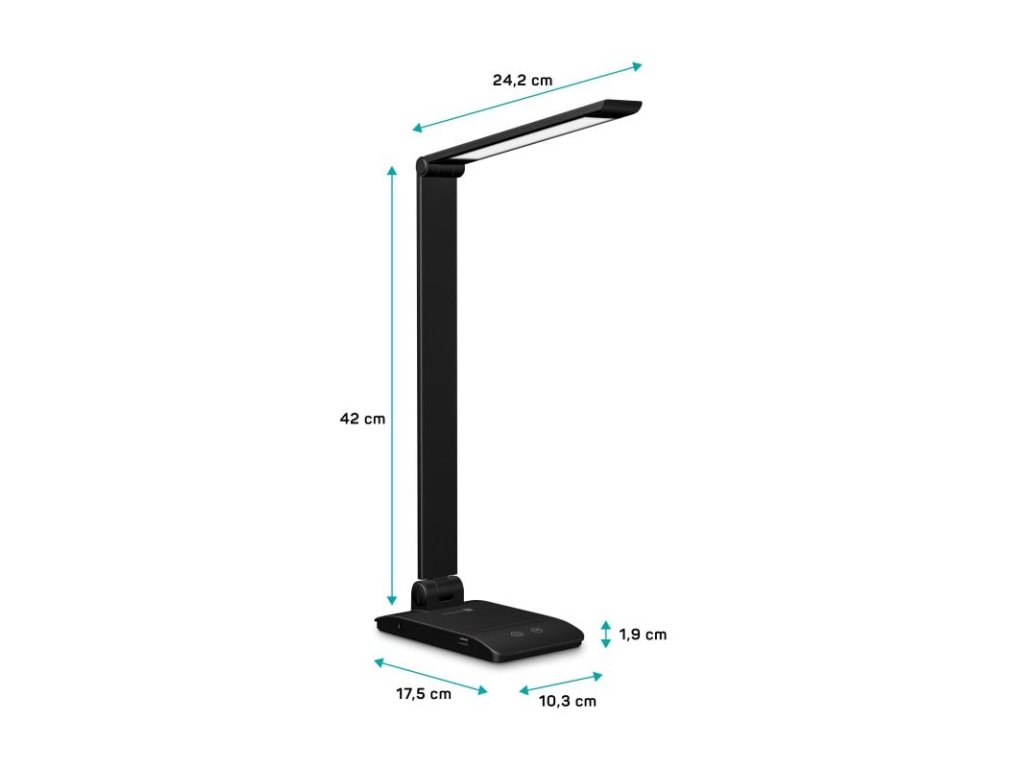 Díky sklopnému rameni a krku nastavíte dokonalý úhel pro jakoukoliv práci. Lampička disponuje USB-A výstupem s výkonem 5 W a dvěma praktickými dotykovými spínači, které umožňují zapnout/vypnout lampu, nastavit 3 úrovně jasu světla nebo nastavit barevnou teplotu světla ve 3 různých úrovních (3000/4000/6500 K).