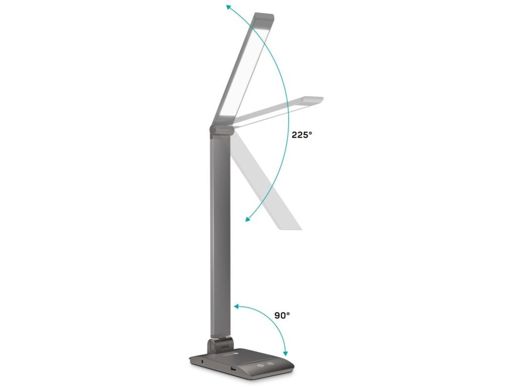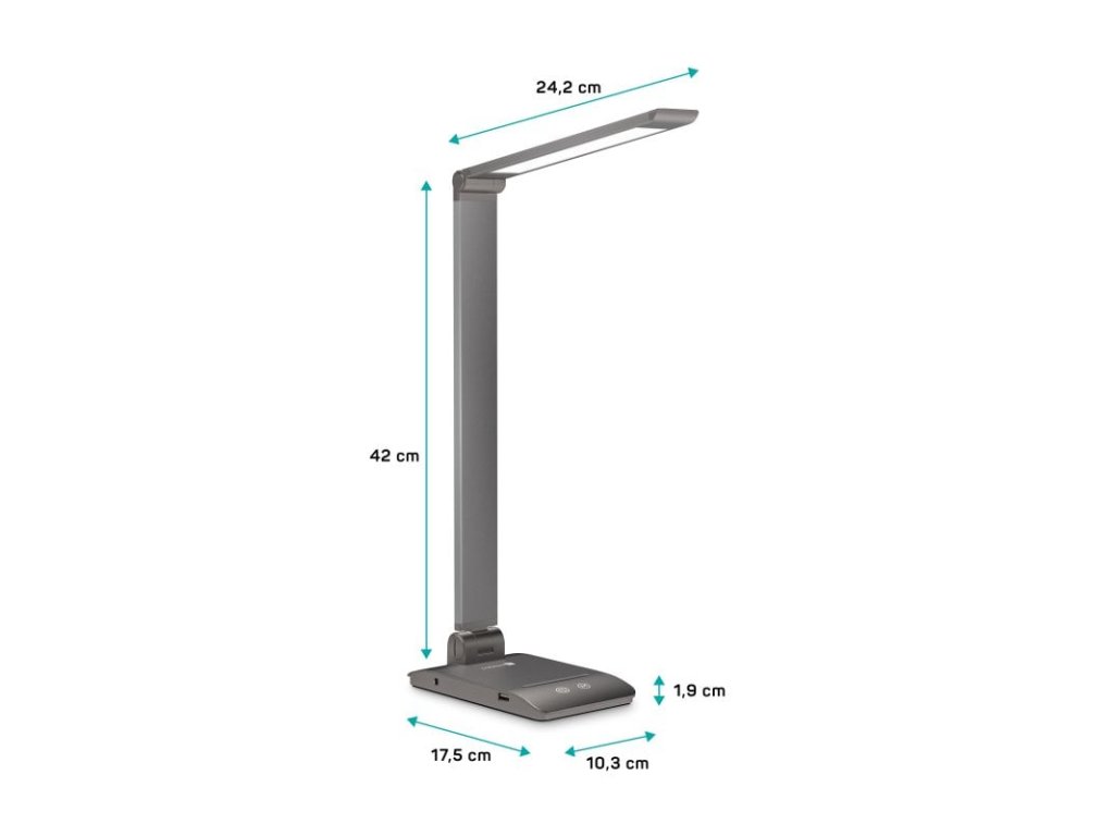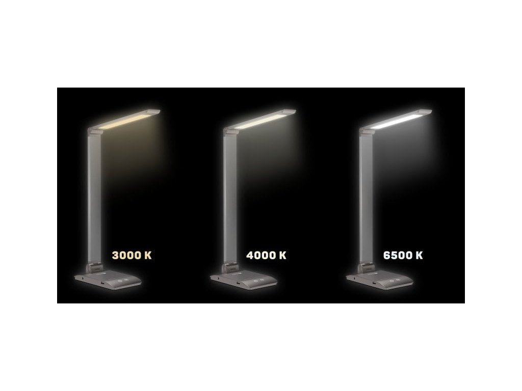 Díky sklopnému rameni a krku nastavíte dokonalý úhel pro jakoukoliv práci. Lampička disponuje USB-A výstupem s výkonem 5 W a dvěma praktickými dotykovými spínači, které umožňují zapnout/vypnout lampu, nastavit 3 úrovně jasu světla nebo nastavit barevnou teplotu světla ve 3 různých úrovních (3000/4000/6500 K).