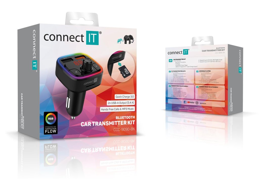 Bluetooth transmitter CarRGB s multibarevným volitelným RGB podsvícením kombinuje tři zařízení v jednom - dvouportovou USB nabíječku, bezdrátové Bluetooth handsfree a hudební přehrávač.